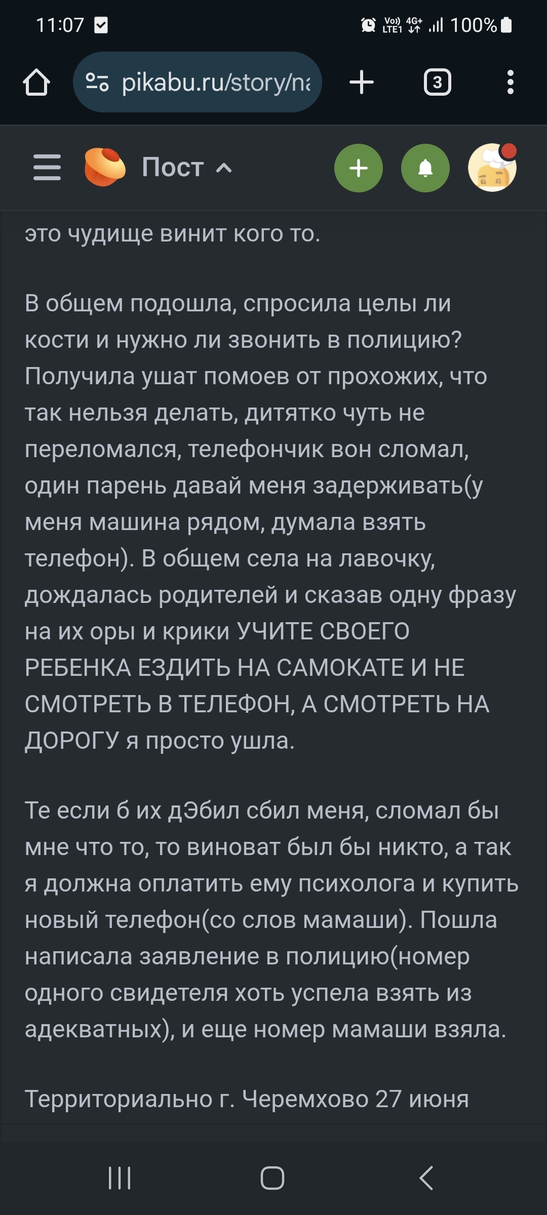 В общем подошла, спросила целы ли кости и нужно ли звонить в полицию? Получила ушат помоев от прохожих, что так нельзя делать, дитятко чуть не переломался, телефончик вон сломал, один парень давай меня задерживать(у меня машина рядом, думала взять телефон). В общем села на лавочку, дождалась родителей и сказав одну фразу на их оры и крики УЧИТЕ СВОЕГО РЕБЕНКА ЕЗДИТЬ НА САМОКАТЕ И НЕ СМОТРЕТЬ В ТЕЛЕФОН, А СМОТРЕТЬ НА ДОРОГУ я просто ушла.