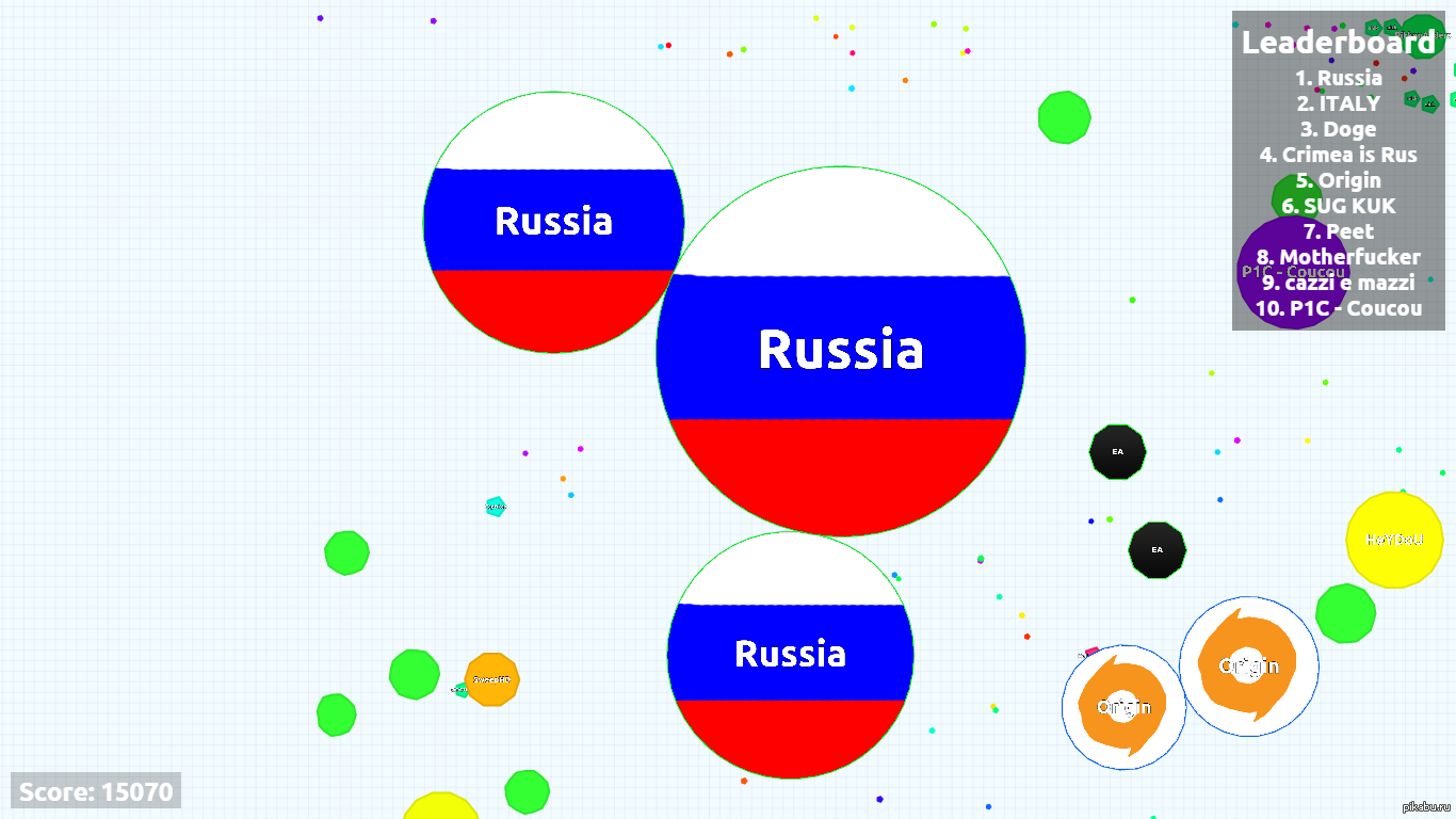 17 RussiaToRussians 10 лет назад На европейском сервере :) С 4м местом (Crimea is Rus) славно всех гоняли) Первый раз увидел 15к очков, набирал еще кто? [моё] Agar Игры Топ Россия Agario