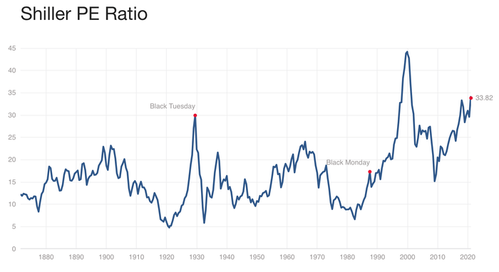 Однако делать какие-либо выводы на основе одного коэффициента P/E неразумно. Может так совпало, что именно в последнее время большинство компаний увеличило капитальные расходы и как следствие у них внушительно просела чистая прибыль. Поэтому давайте посмотрим на показатель CAPE (Cyclically Adjusted Price/Earning Ratio) или коэффициент P/E Шиллера по индексу S&P 500, где вместо «earnings» берётся средняя прибыль за последние 10 лет, скорректированная на инфляцию.