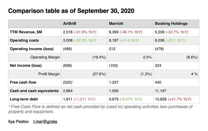 Примечательно ещё то, что рынок почему-то оценил AirBnB значительно дороже Booking Holdings и Marriott, капитализация которых составляет 85 и 40 миллиардов долларов соответственно. В ноябре, когда на сайте Комиссии по ценным бумагам США появился проспект IPO, я публиковал сравнительную таблицу этих трёх компаний.