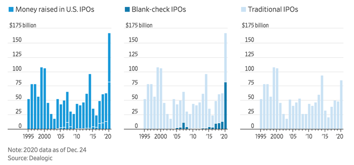 Аномальная переоценка по мультипликаторам — это лишь самое скромное из того, что сегодня происходит на рынке. В 2020 году состоялось 248 SPAC IPO, в результате которых было привлечено более $83 млрд. По сравнению с 2019 годом количество таких IPO выросло на 500%, а объём привлечённого капитала увеличился в 6 раз.