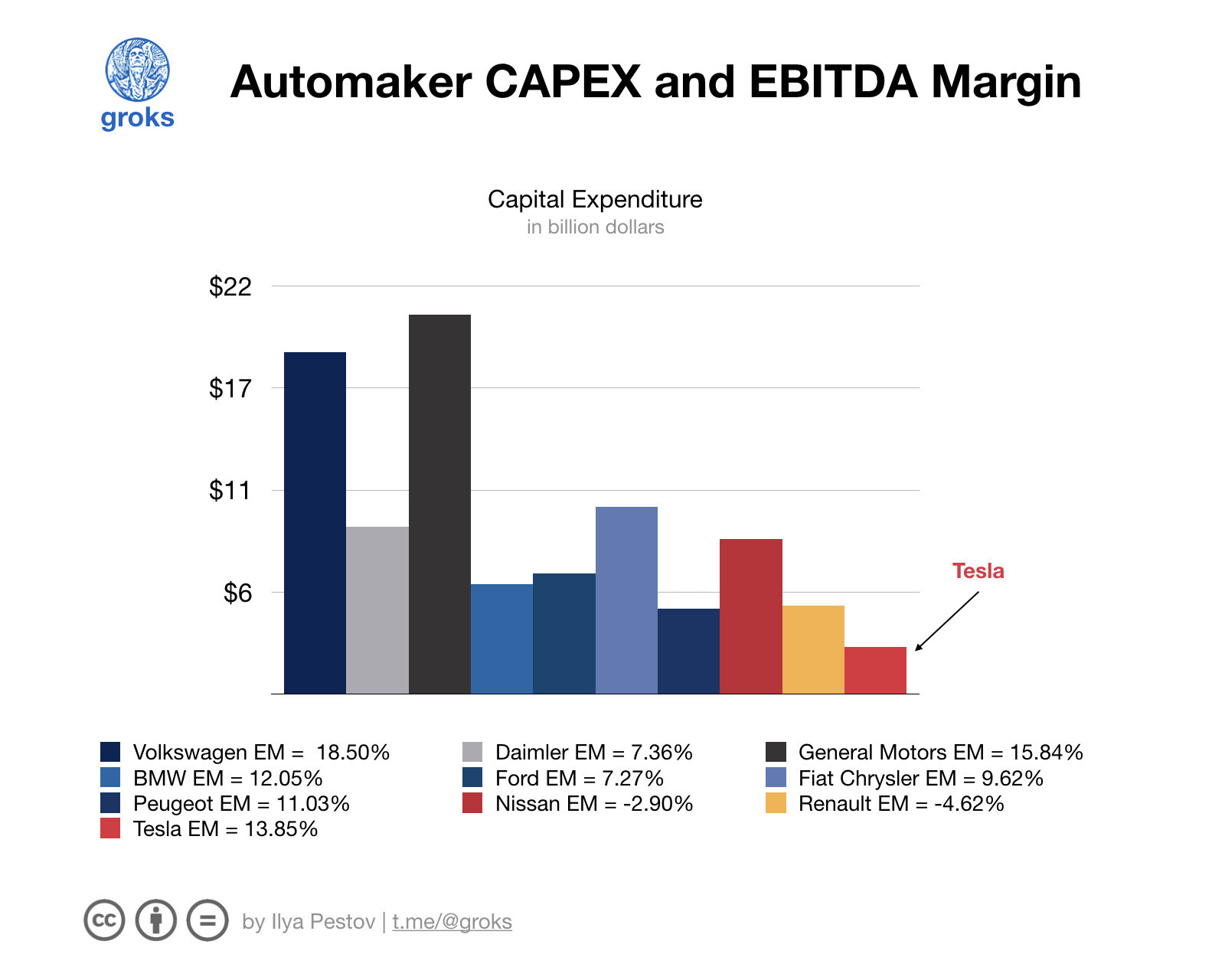 Фанаты бренда Маска верят в исключительное финансовое превосходство его компании, но маржинальность по ЕБИТДе у Tesla меньше, чем у того же Volkswagen или General Motors. Вы думаете только Маск инвестирует в будущее? Однако у каждой из упомянутых корпораций CAPEX больше, чем у Tesla. Одни лишь бумаги $TSLA — это огромный пузырь из сотен миллиардов долларов, а похожих компаний на рынке огромное множество.