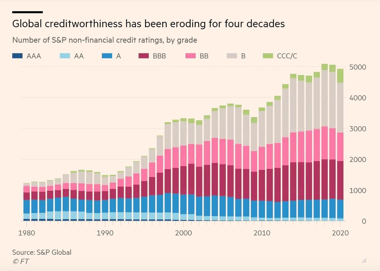 Посмотрите на кредитное качество публичных нефинансовых компаний по методологии Standard & Poor’s. В 1980 году было 65 эмитентов с рейтингом AAA, а сейчас их всего 5. Раньше более половины компаний от общего числа находились в А категории, сегодня большинству компаний присвоен мусорный рейтинг (BB и ниже).