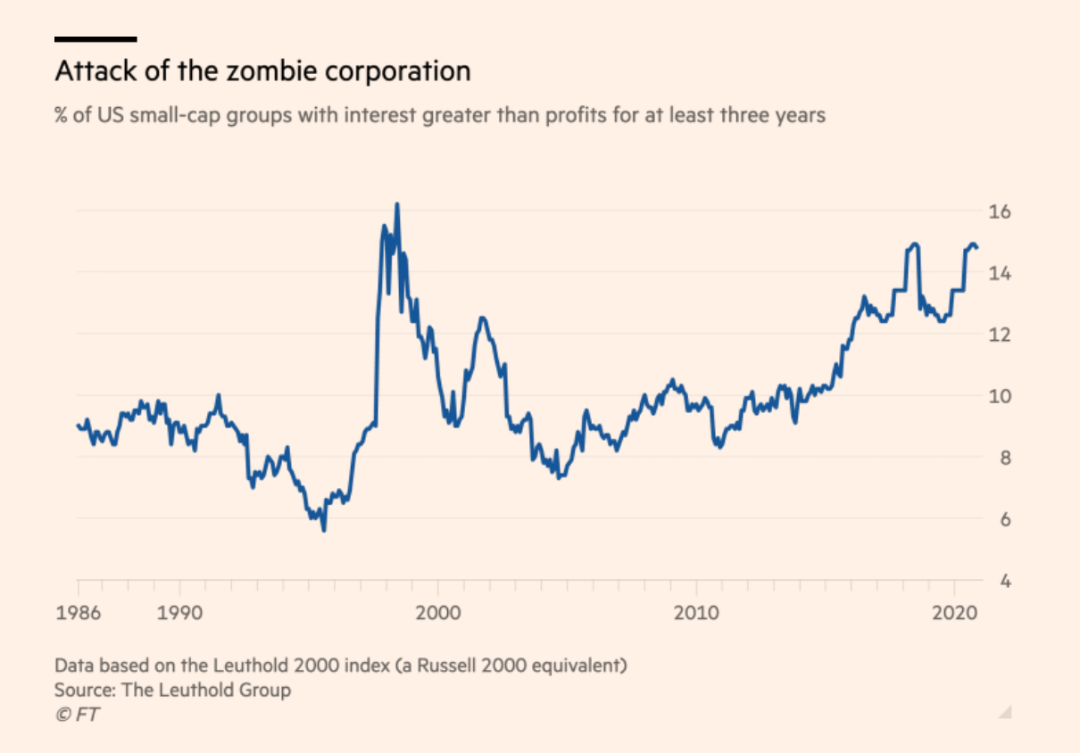 В статье Financial Times с заголовком «Fed backstop masks rising risks in America’s corporate debt market» мне повстречалась ещё одна интересная цифра: у каждой седьмой компании с капитализацией от $300 млн до $2 млрд выплаты процентов по кредитам и облигациям превышают размер прибыли на протяжении 3 последних лет. Опять же, это сравнимо только с началом нулевых.