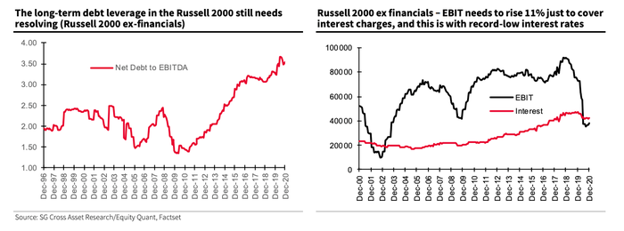 Однако риски банкротства нисколько не смущают инвесторов. За последние 10 месяцев индекс S&P 500 вырос на 70%. Это более чем в два раза выше нормальной скорости подъёма бычьего рынка. А Russell 2000 за тот же период вырос на 100%, хотя долговая нагрузка по компаниям из этого индекса превысила их доходы до вычета налогов, о чём свидетельствуют данные Societe Generale.