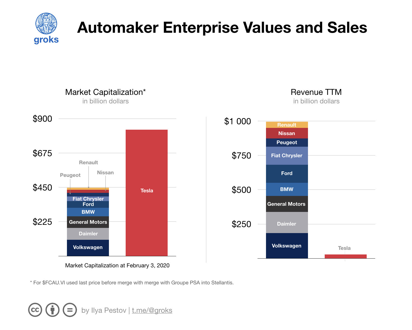 Биржевая стоимость Tesla значительно выше капитализации 9 всем известных автоконцернов несмотря на то, что их суммарная выручка в 50 с лишним раз больше, чем у предприятия Маска. При этом каждая из 9 компаний «старого толка» производит электромобили, и, например, продажи таковых в единицах продукции у Renault и Nissan составляют половину от продаж Tesla.