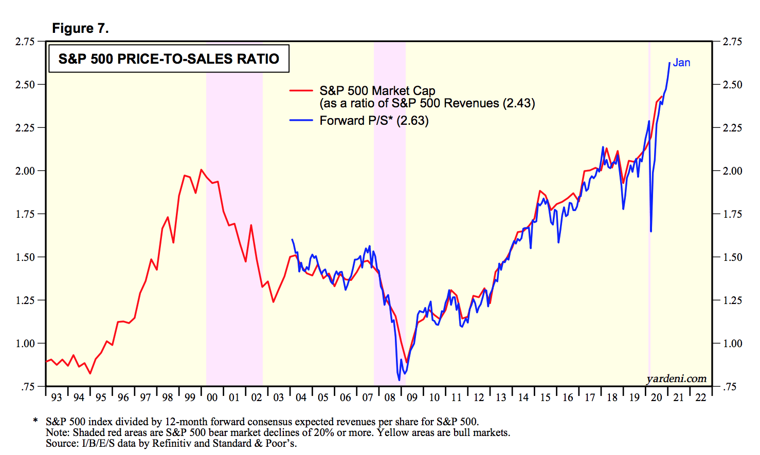 Сегодняшнее значение CAPE превышает таковое перед чёрным вторником, который предшествовал началу Великой депрессии США. Однако мы отчётливо видим, что показатель CAPE был значительно выше в начале нулевых, когда раздувался пузырь доткомов. Кому-то может показаться, что всё ещё не так уж и плохо, но для того, чтобы сделать выводы, нужно мыслить системно и рассматривать целый комплекс метрик. Поэтому я предлагаю вам взглянуть на коэффициент P/S — соотношение цены и продаж.