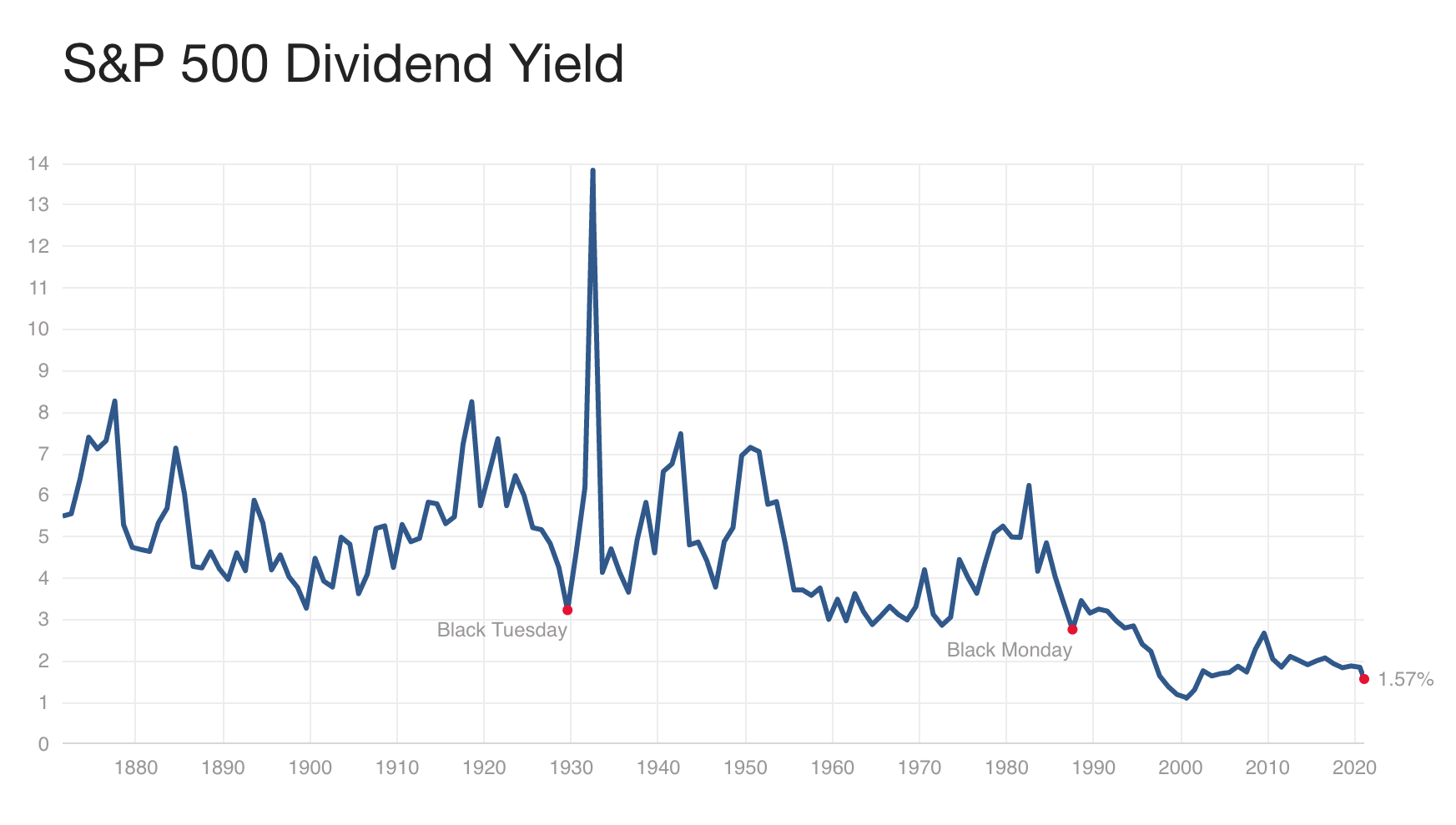Значение P/S находится на историческом максимуме. Даже в период бума доткомов оценки по этому показателю были скромнее, и обратите внимание, какие они были в самом начале девяностых. Безусловно, у технологических компаний маржинальность выше, чем у офлайн-бизнеса, и P/S должен был вырасти с появлением интернета. Но сегодня Snowflake оценивается почти в 150 выручек, Zoom — в 60, Tesla — в 30. А теперь посмотрите на дивидендную доходность по S&P 500.