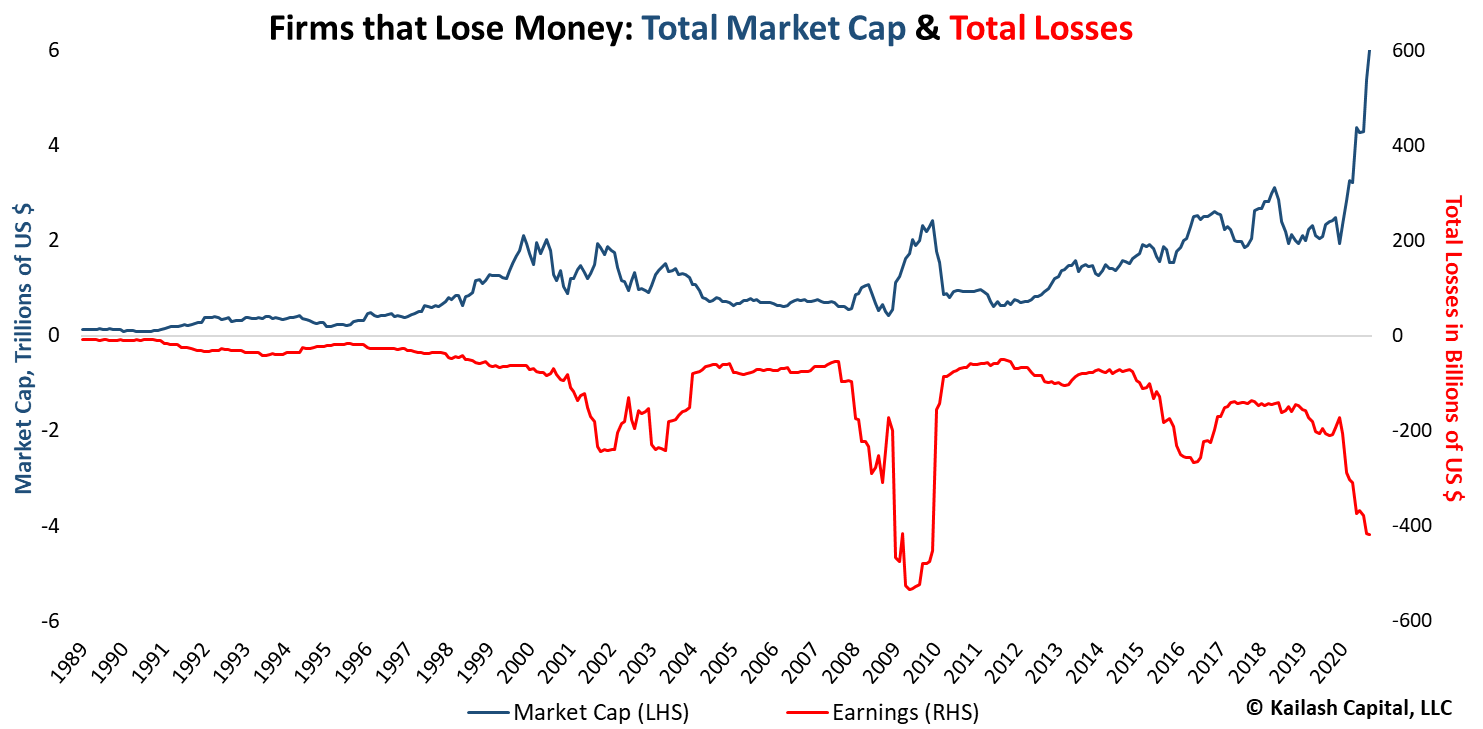 При всём при этом есть ещё множество компаний с отрицательной доходностью, для которых P/E не считается в принципе. У меня нет свежих цифр, но в 2018 году 83% компаний, вышедших на IPO, были убыточными — и это на два процентных пункта больше, чем в 2000 году. А сегодня акции убыточных технологических компаний показывают доселе невиданный экспоненциальный рост.