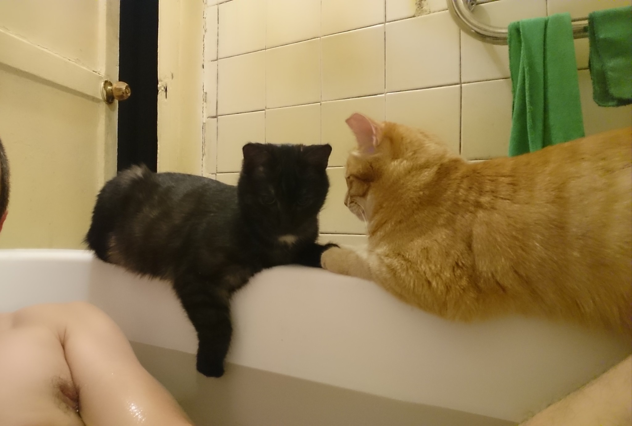 Самое забавное, купаться оба не любят, но на ванне посидеть милое дело))