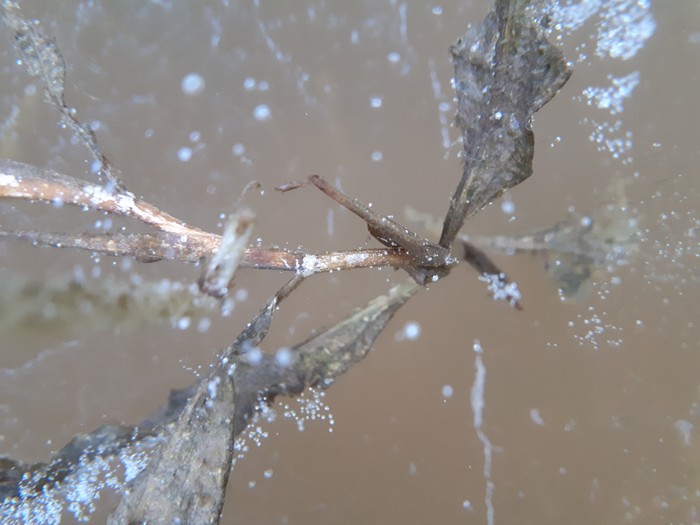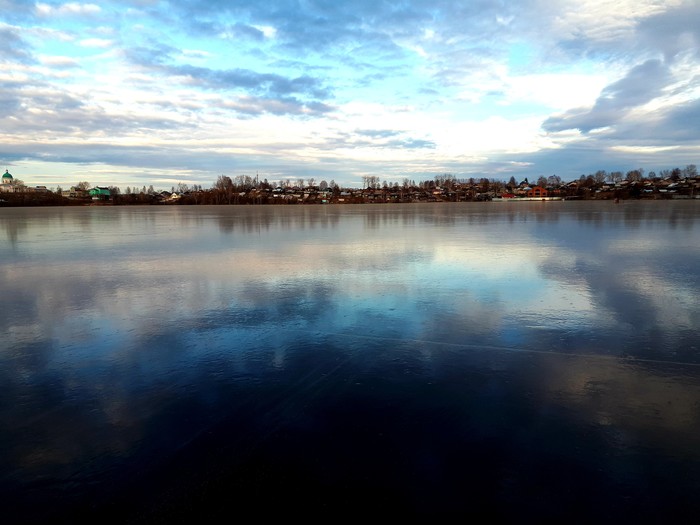 ...пулей вылетаю из устья Исы на лёд Салдинки. Там лёд попрочнее и местами видны лунки оставшиеся от рыбаков. Облегчение невероятное. Такого бодрячка я давно не испытывал. На радостях от чудесного спасения промахнулся мимо канала и уехал вверх по реке. У моста сообразил, что свернул не туда, вернулся, аккуратно заглянул в русло канала, там льда не было вовсе. Но я это и ожидал, а вот такой подлянки от Исы нет. Вдоль канала тропкой вышел на Верхнесалдинский пруд и топнул его насквозь уже без приключений . На память остались офигенные фотки чистого льда. Оригинал, конечно, лучше но и просто картинки тоже норм