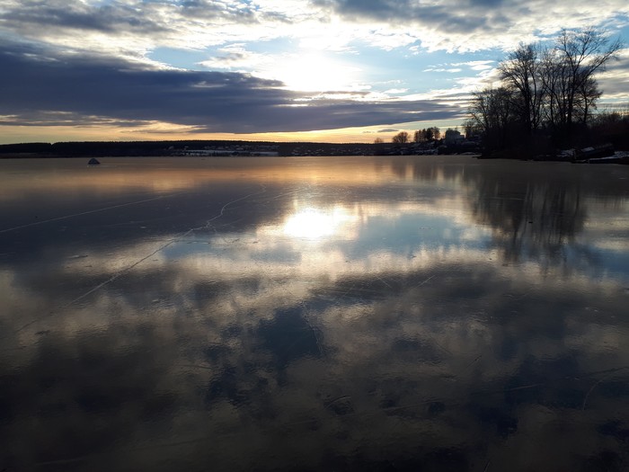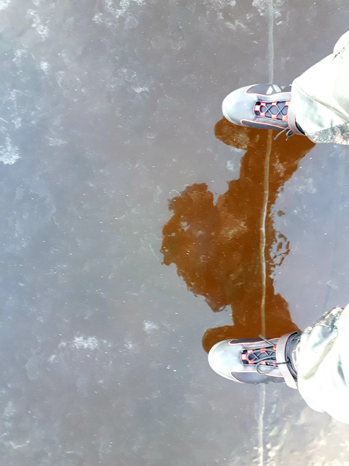 Как-то внезапно решил научиться кататься на коньках. Предыдущие несколько десятилетий не случилось, а тут вот загорелся. И после того как я пару-тройку раз покатался по корту, вернее, первый раз вообще вдоль стеночки ползал, но потом вроде пошло, я решил вырваться на оперативный простор. Крайне удачно, что снегопадов не было, а водоёмы уже замерзли. Малый опыт меня не тревожил - ничего сложного в этих ваших коньках не оказалось. В общем, вперёд! На лёд, товарищи! Вначале все шло нормально, я осваивал просторы Исинского пруда, любовался видами развалин бывших п/лагерей, а вот Черемшанка, а вот Рыбное. На льду местами попадались засидки на утку, такие сооружения из жердей и лапника. Подо льдом плавали рыбки и росли водоросли, осьминогами раскинулись замшелые пни