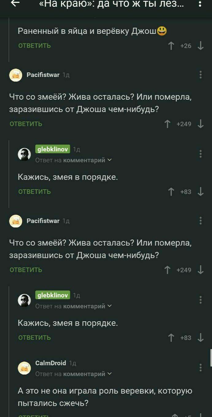Джош суёт руку в расщелину и его жалит змея. Джош кричит, но вообще змея не наносит ему никакого краткосрочного урона, и он снова бросается на Келли. Теперь в честной схватке Келли бьёт Джоша коленом по яйцам и перерезает ему верёвку. Раненный в яйца и в верёвку Джош повисает локтями на уступе, как Леонардо ди Каприо в конце «Титаника» на двери.