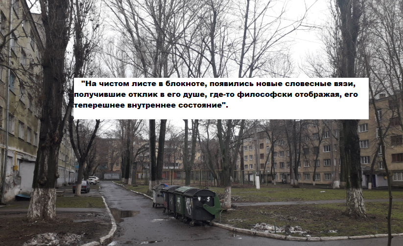 Потом свернул в пространство между зданиями «четверки» и «пятерки», к волейбольной площадке. Присев на железную трубу, импровизированного тренажера, он открыл свой «Незабывальник» и записал в него, несколько посетивших сейчас его мыслей. На чистом листе в блокноте, появились новые словесные вязи, получившие отклик в его душе, где-то философски отображая, его теперешнее внутреннее состояние.