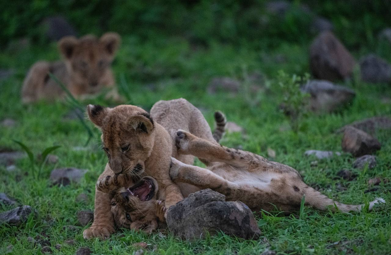 Дело близится к вечеру, и у львят просыпаются бойцовские инстинкты. И тогда будущие львы оттачивают свои навыки в детских схватках.