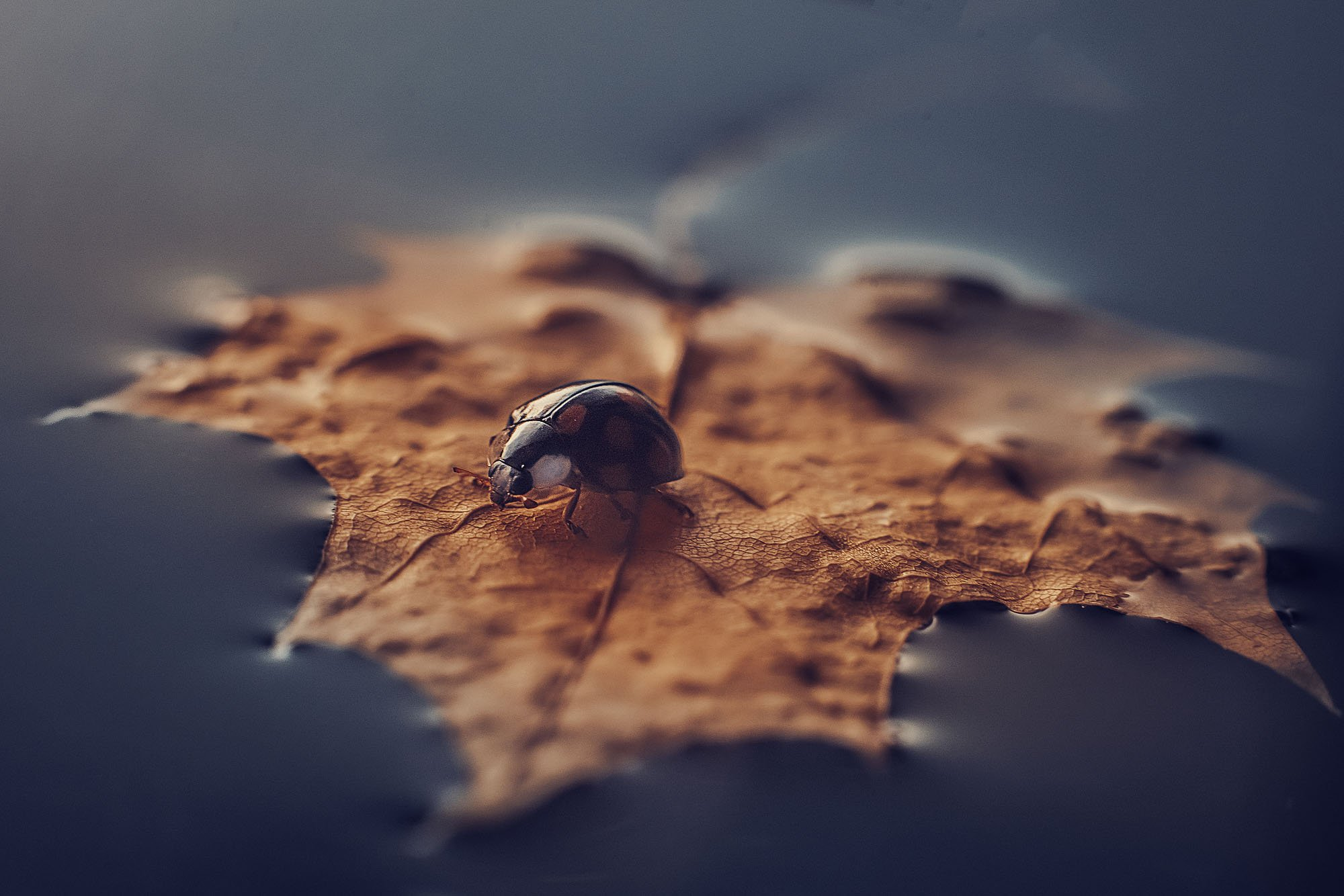 В тихом осеннем танце природы встретились два удивительных создания — благородный кленовый лист и крошечная божья коровка.