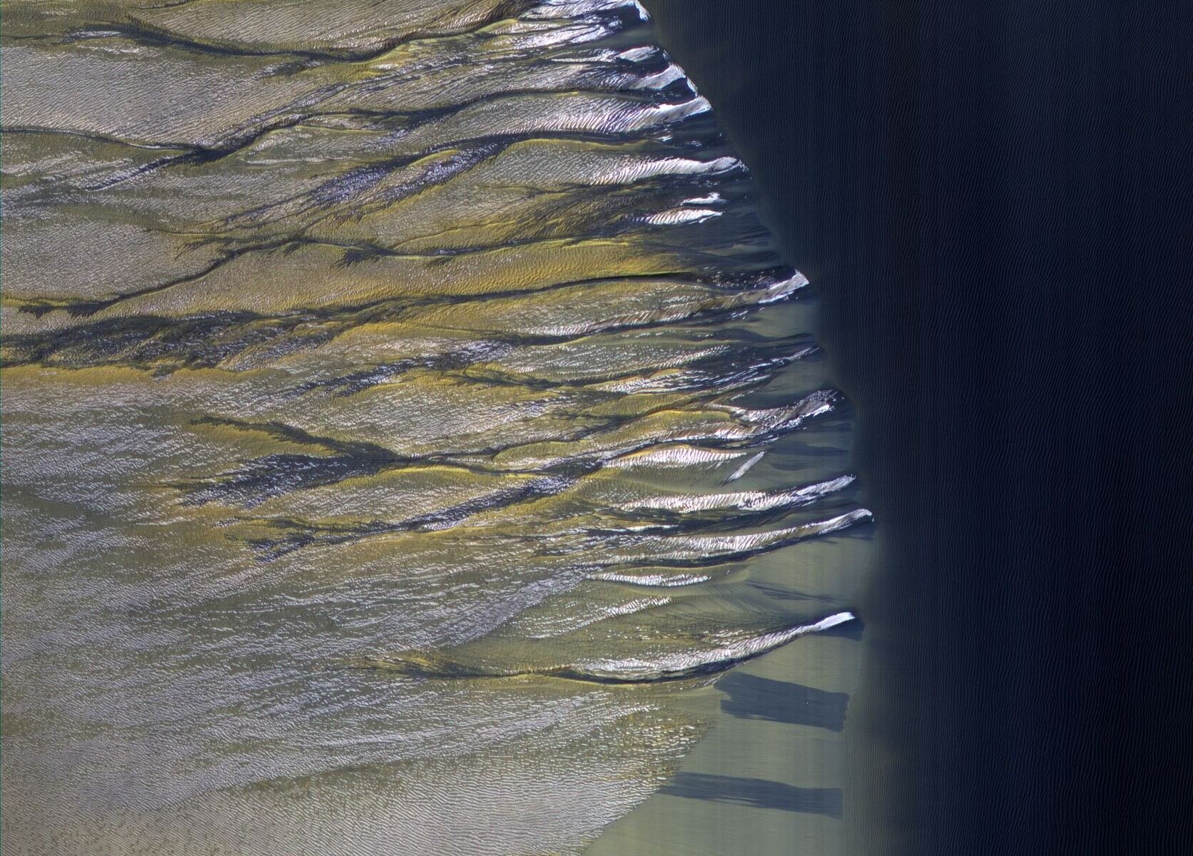 Зимой темные песчаные дюны покрыты слоем белого сезонного льда, который вы можете увидеть на изображении. Но на самом деле это изображение показывает начало марсианской весны, когда солнечная сторона дюн только начала оттаивать.