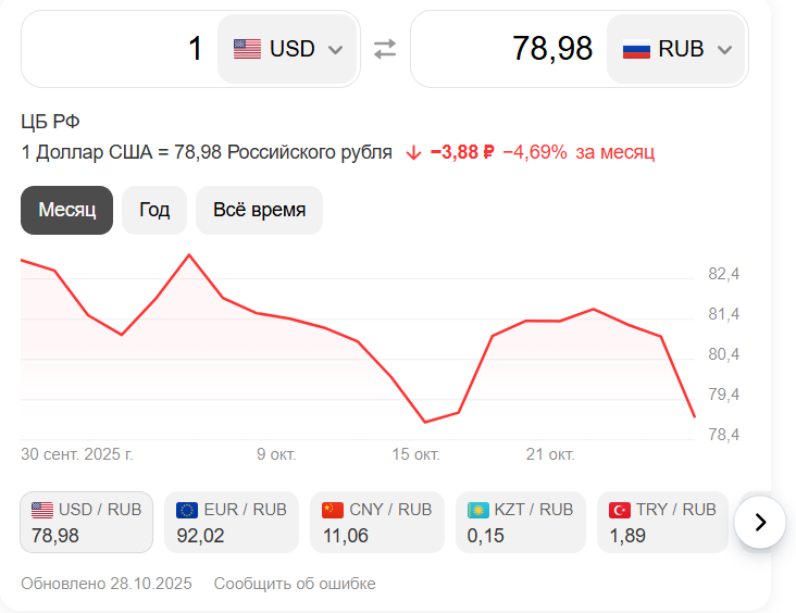 Вечный фьючерс на доллар США (USDRUBF) на Мосбирже в понедельник, 27 октября, подешевел на 1,3% и на минимуме достиг ₽78,98, свидетельствуют данные на 10:34 мск. Ниже уровня ₽79 фьючерс торгуется впервые с 16 октября.