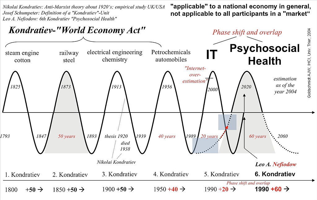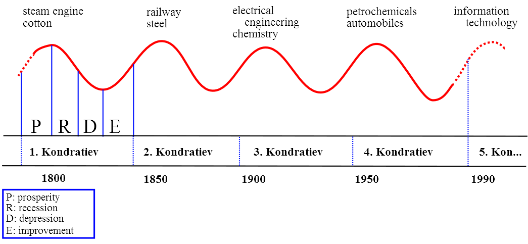 В 1922 году Кондратьев опубликовал наблюдение, согласно которому в долгосрочной динамике некоторых экономических индикаторов наблюдается определенная циклическая регулярность, в ходе которой на смену фазам роста соответствующих показателей приходят фазы их относительного спада с характерным периодом этих долгосрочных колебаний порядка 50 лет