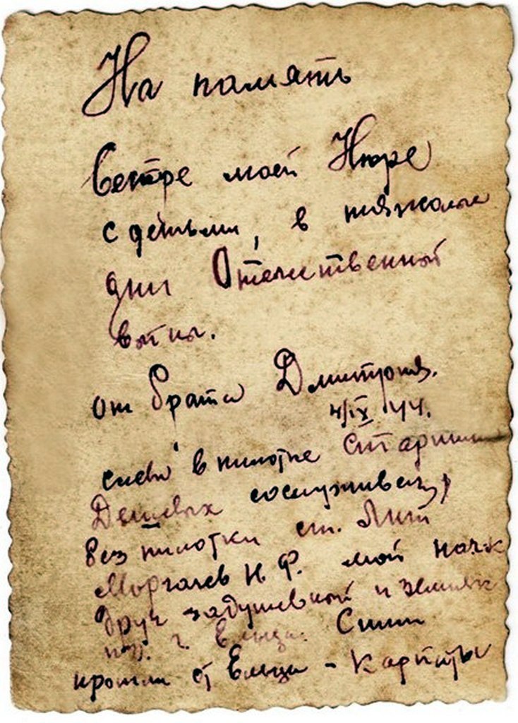На память сестре моей Нюре с детьми, в тяжелые дни Отечественной войны. От брата Дмитрия. 4.IX.44. Слева в пилотке старшина Дешевых сослуживец без пилотки ст. лейт. Моргачев Н. Ф. мой нач. к. друг задушевный по г. Елец. С ним прошли от Ельцы - Карпаты (пунктуация как на фотографии)