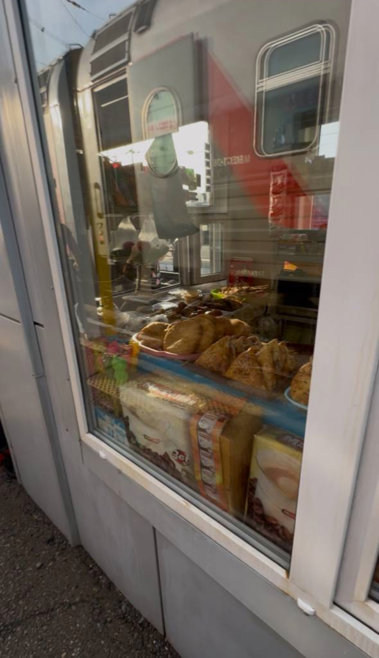 На станции стояли цивильные ларьки, в которых была возможность купить все, начиная от воды заканчивая горячим ужином и пирожками)) но алкоголя там естественно не было) а еды у нас и так хватает)