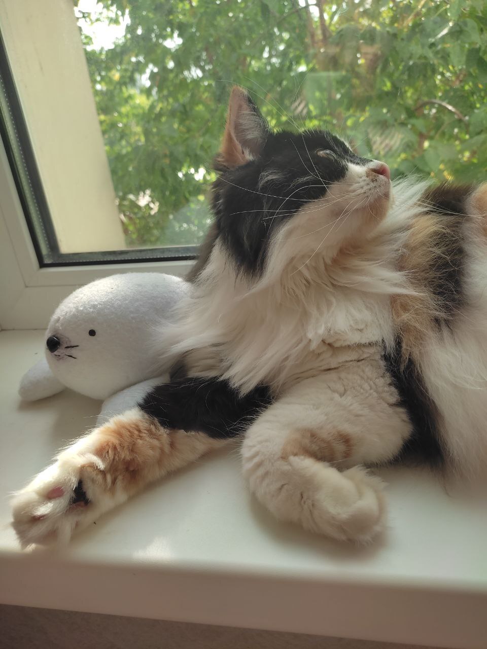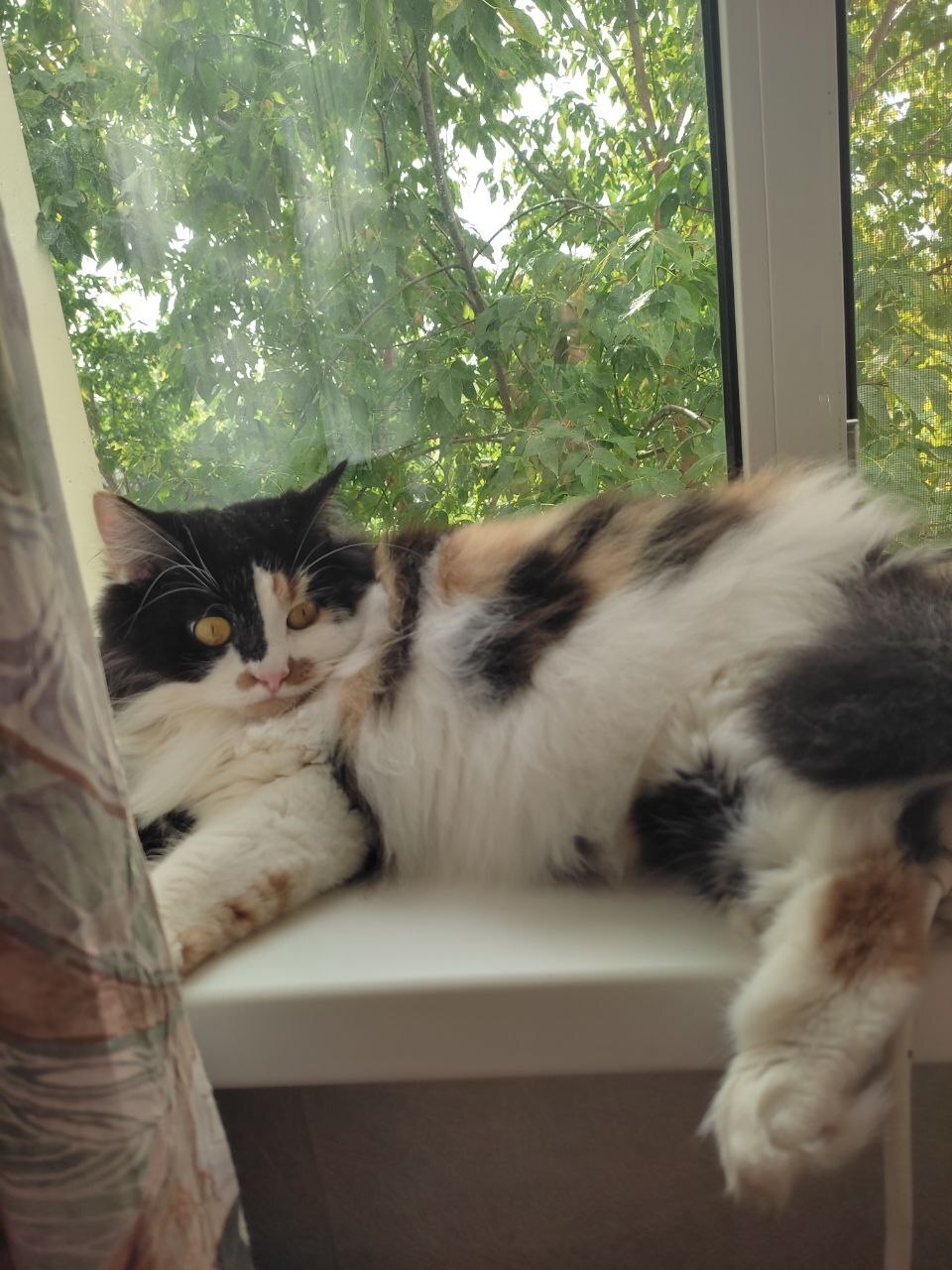 За окном поселилась птичка и кошь перебралась жить на подоконник.