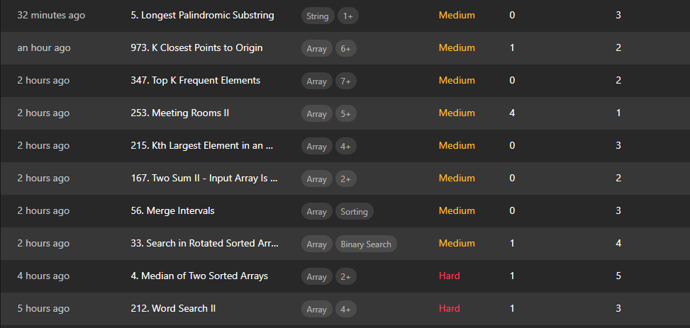 За последние 4 дня - 9 алгоритмов уровня Hard, 22 алгоритма Medium и 7 Easy. Практически все - без заглядываний в рефы.