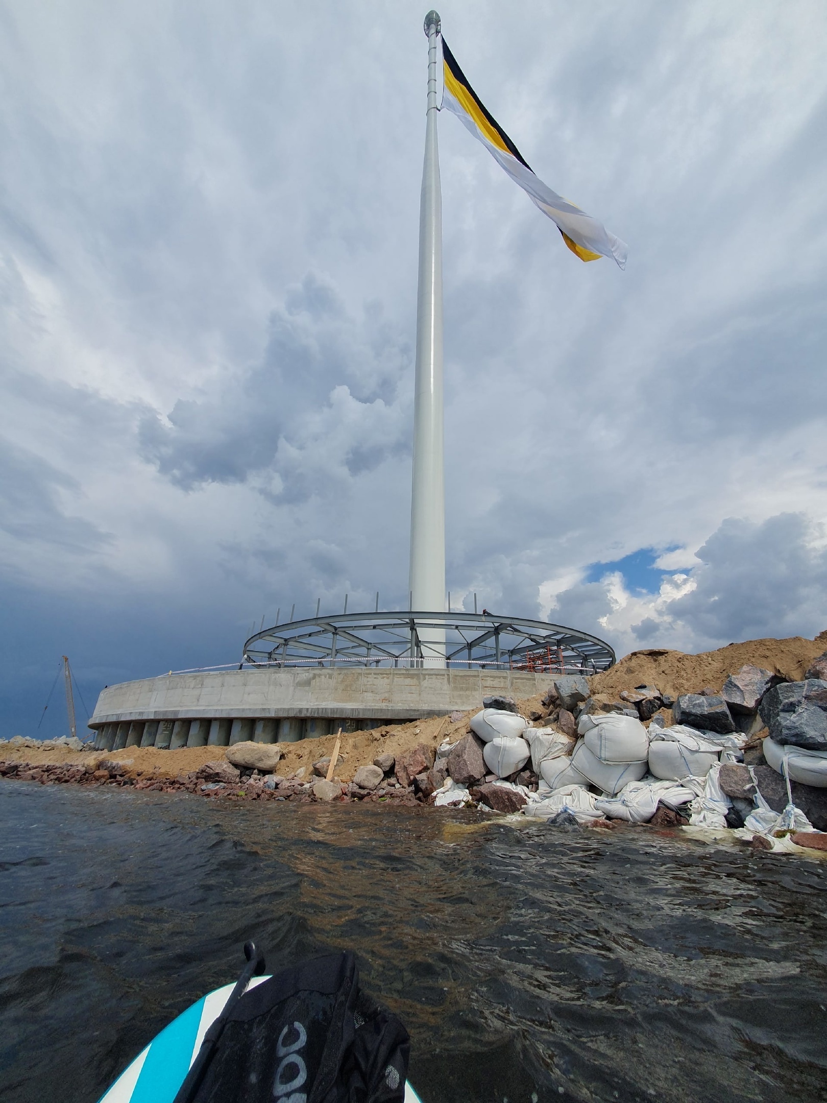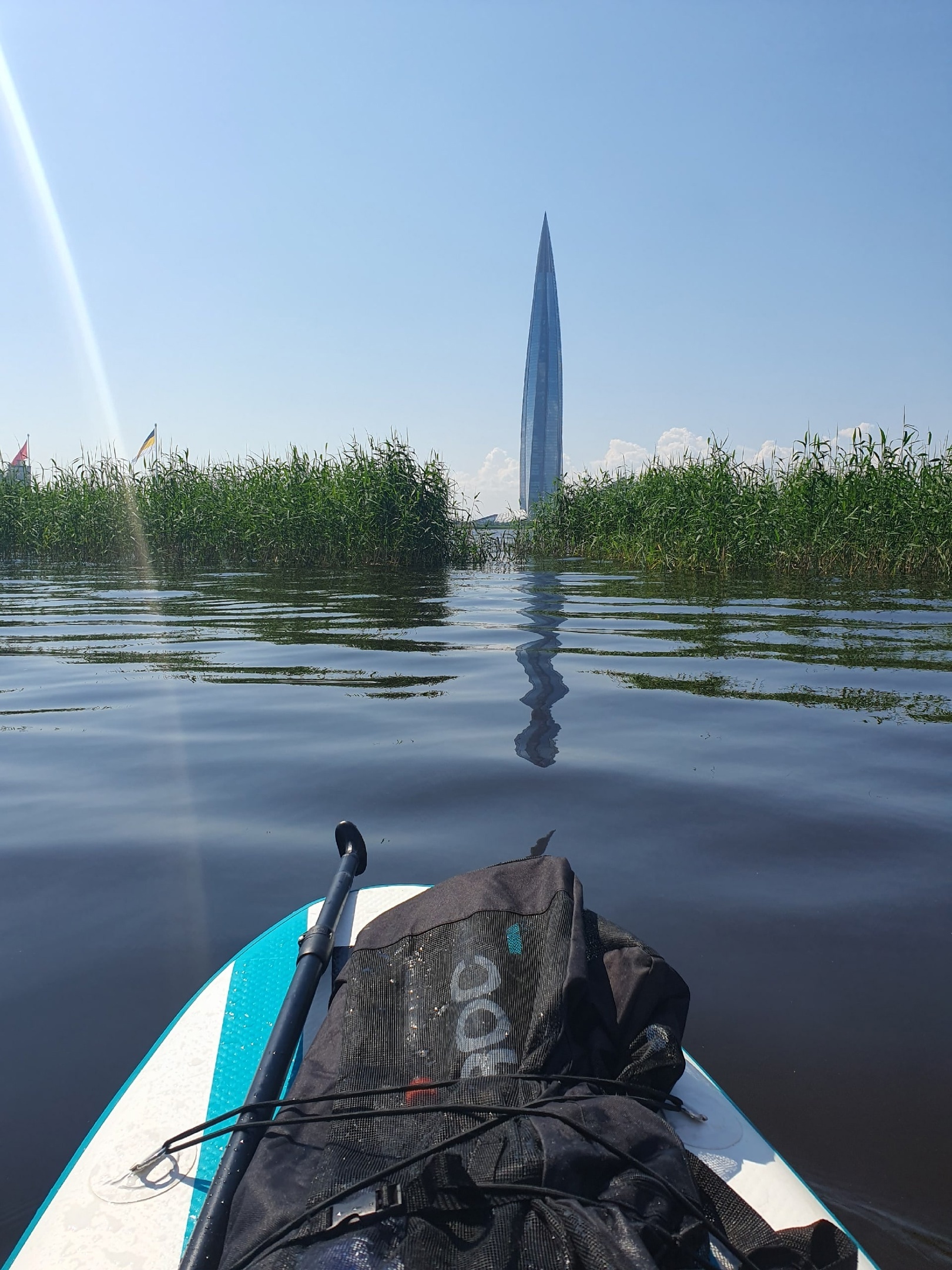 На открытой части залива почти всегда есть небольшие волны, хорошо что сап достаточно к этому устойчив. В проливе между Лахтой и флагами есть хороший водный проход под мостами, движение судов там нет. Да и на заливе фарватер достаточно далеко, мешать некому.