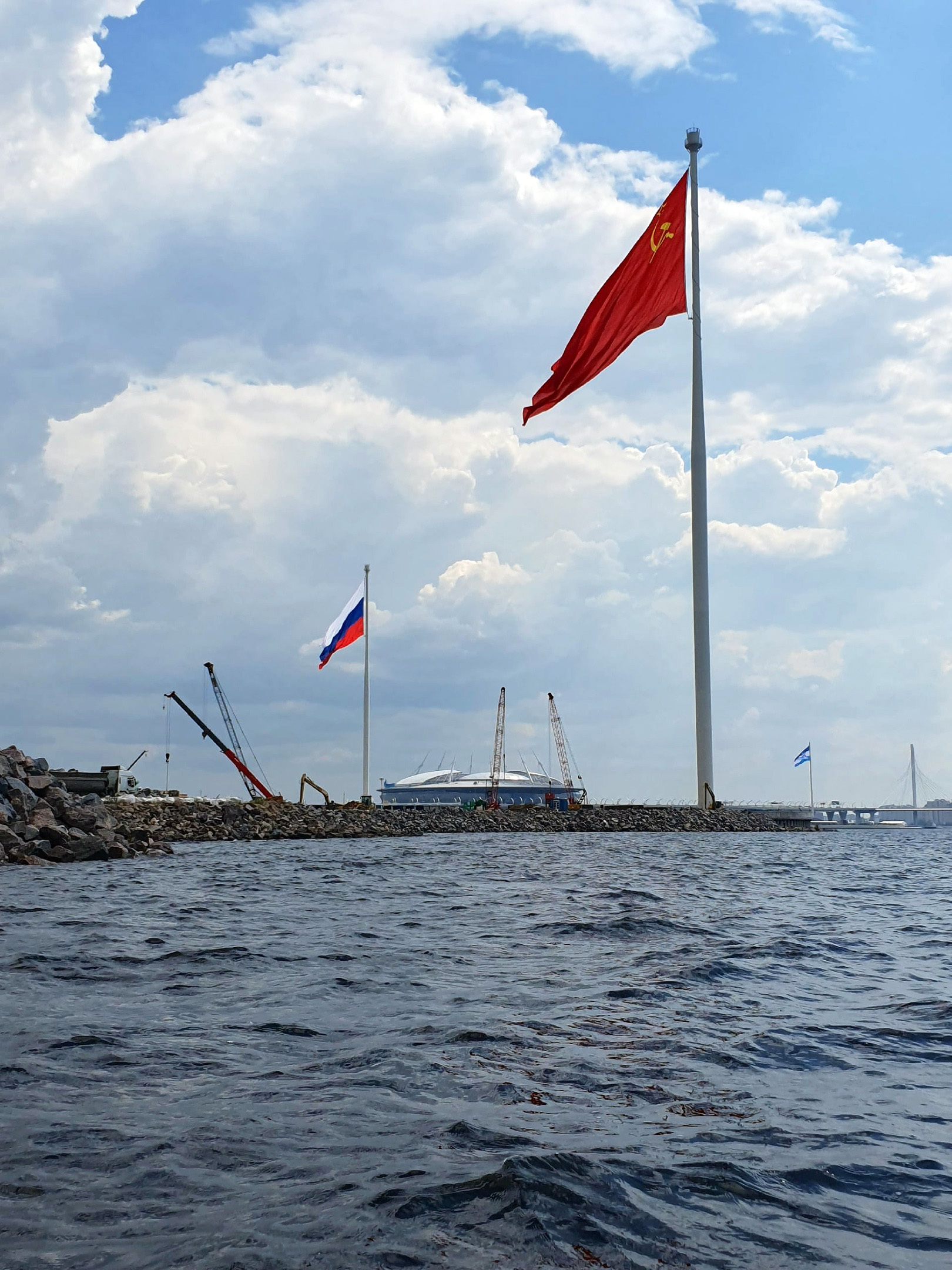 С воды можно близко подплыть к трем огромным флагам: Российской Империи, СССР и РФ: