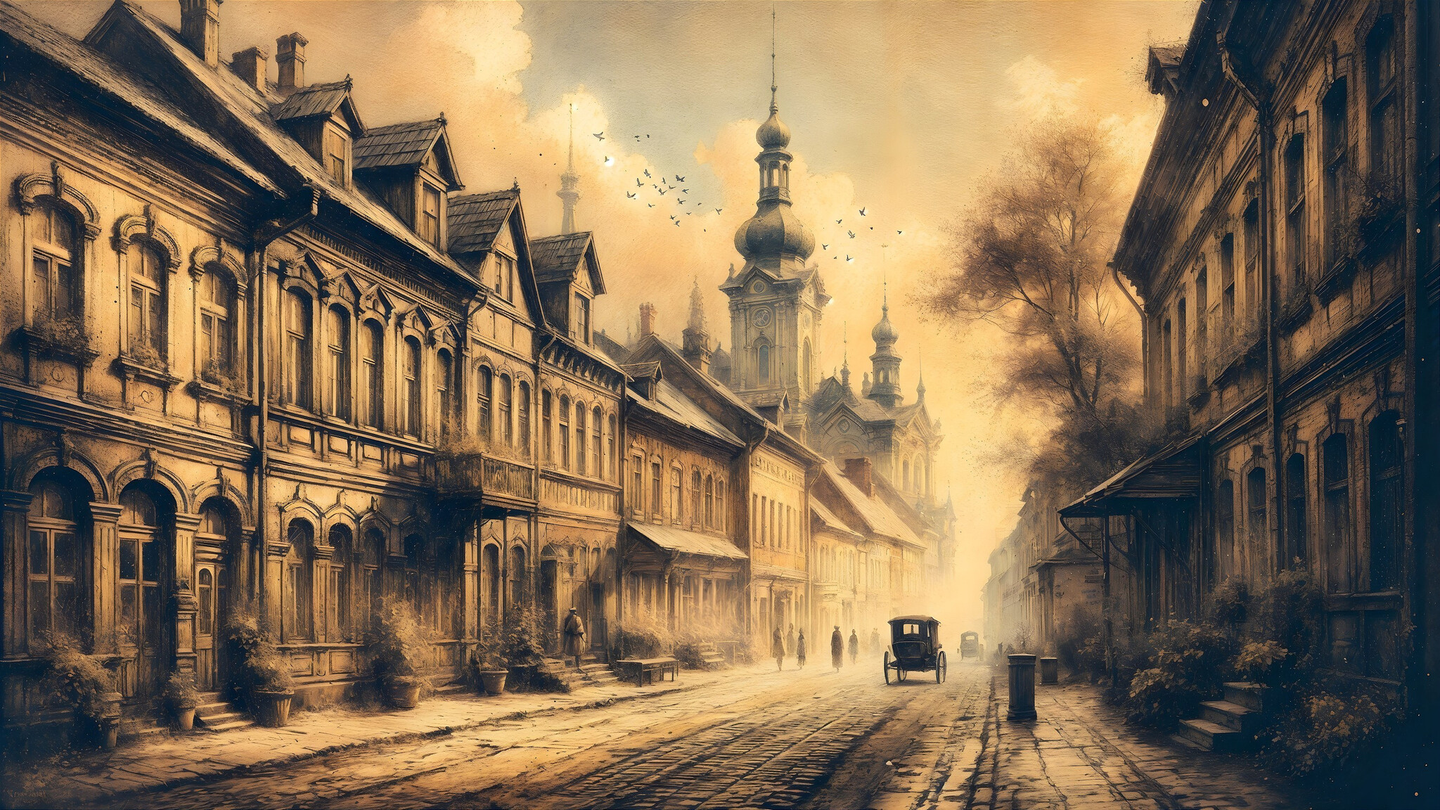 Prompt: Nostalgic XIX-century Sumy street scene, mixed-media masterpiece, Bohdan Pylypiv style blend of pyrography and watercolor, sepia tones, detailed woodburned outlines, delicate watercolor accents, digital painting, pastel colors, faded hues, old photograph effect, dust particles ambiance, highly detailed textures, elegant and crisp, reminiscent of Gustave Moreau, faded colors for a vintage touch, worn textures, time-lapse essence, echoes of the past, landscape view, nostalgic mood.