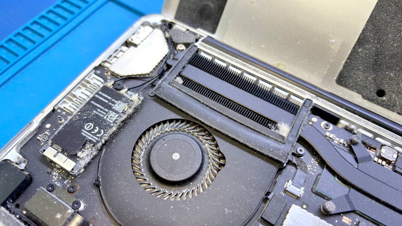 При осмотре стало ясно: MacBook давно не открывался. Внутри — пыль, сухая термопаста, разъёмы уже просят внимания.