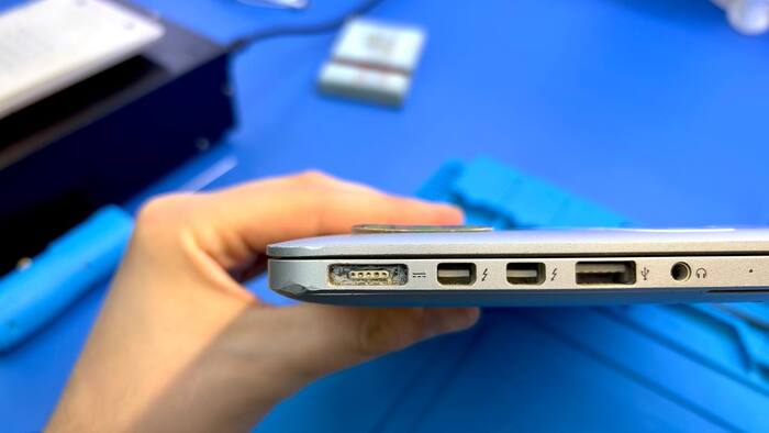 — Полноценные порты: два USB, HDMI, SD-кардридер и MagSafe — тот самый магнитный разъём, который спас не один ноутбук от падения.