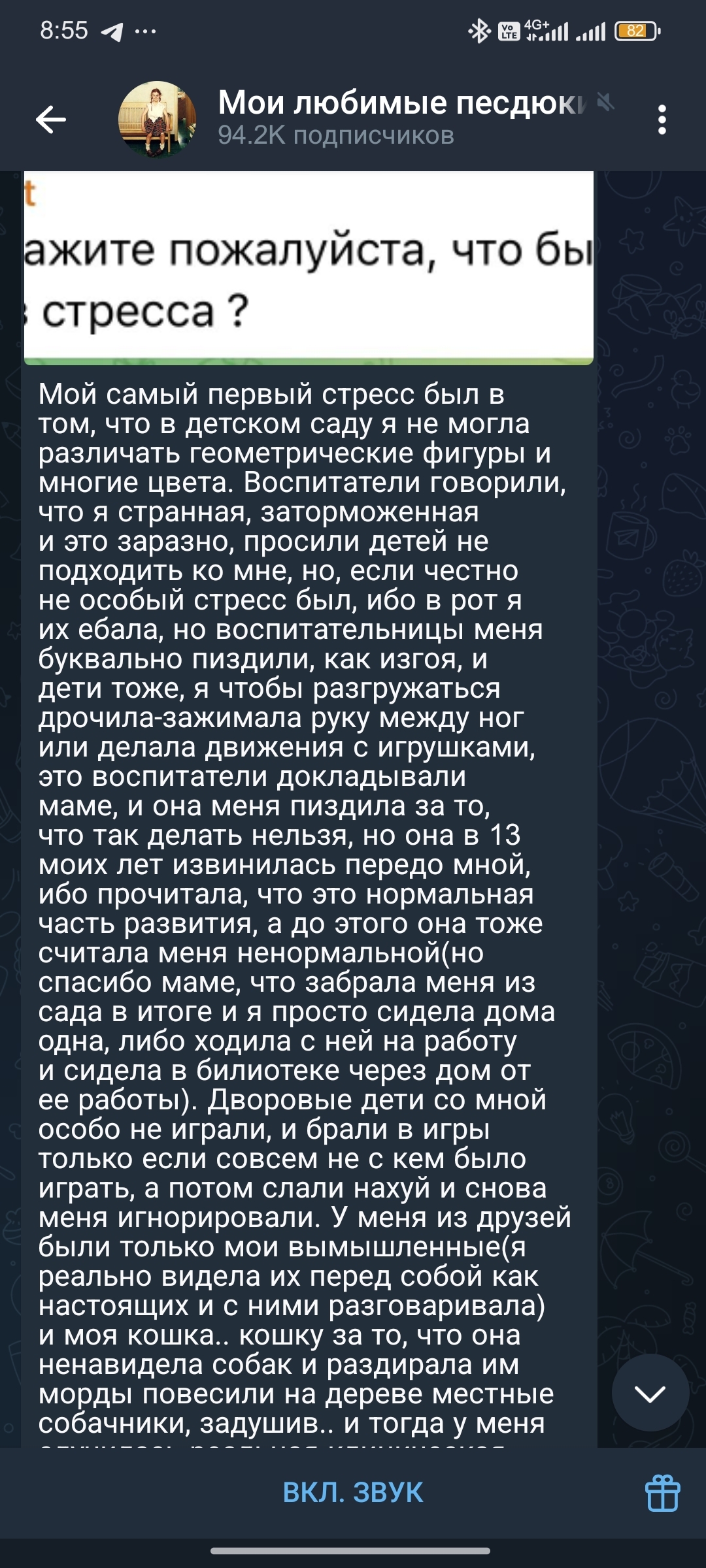 3 erkegoer Реальные истории из жизни На такое смотришь, и думаешь: "грех жаловаться"... 2 месяца назад https://t.me/pezduks/2585 Жизненно Судьба Здоровье Смерть Стресс Травля Родители и дети Клиническая смерть Психика Детский сад Воспитатели Telegram (ссылка) Длиннопост Ещё 0