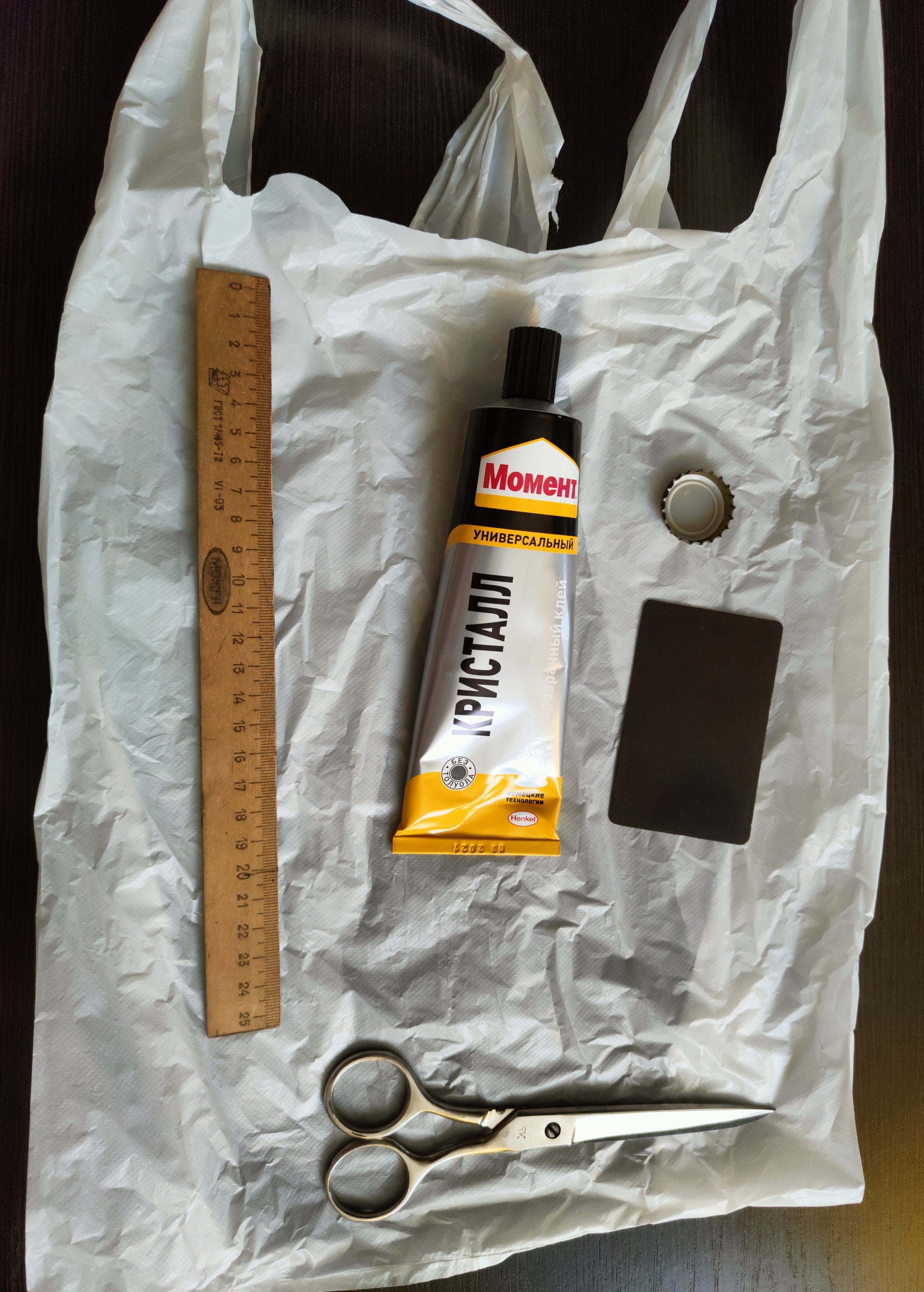Нам понадобится: пробка, клей(я вот такой купил, вы можете любой который нравится), линейка и ножницы(можно ножик, если удобно). И виниловая "рекламка" которые кидают в почтовый ящик, или раздают на улице, с суши или пиццей привозят - да откуда угодно можно.