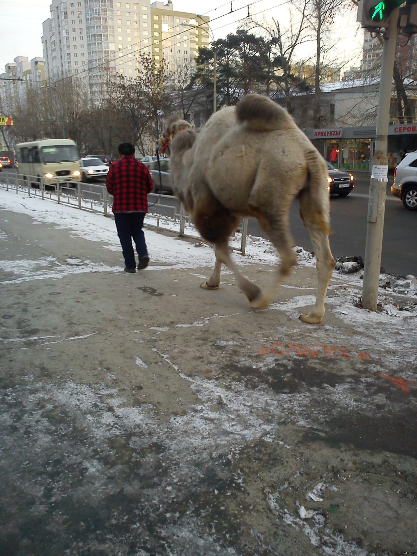 Ничего необычного, просто мужик выгуливает своего верблюда. К слову, на улице -16