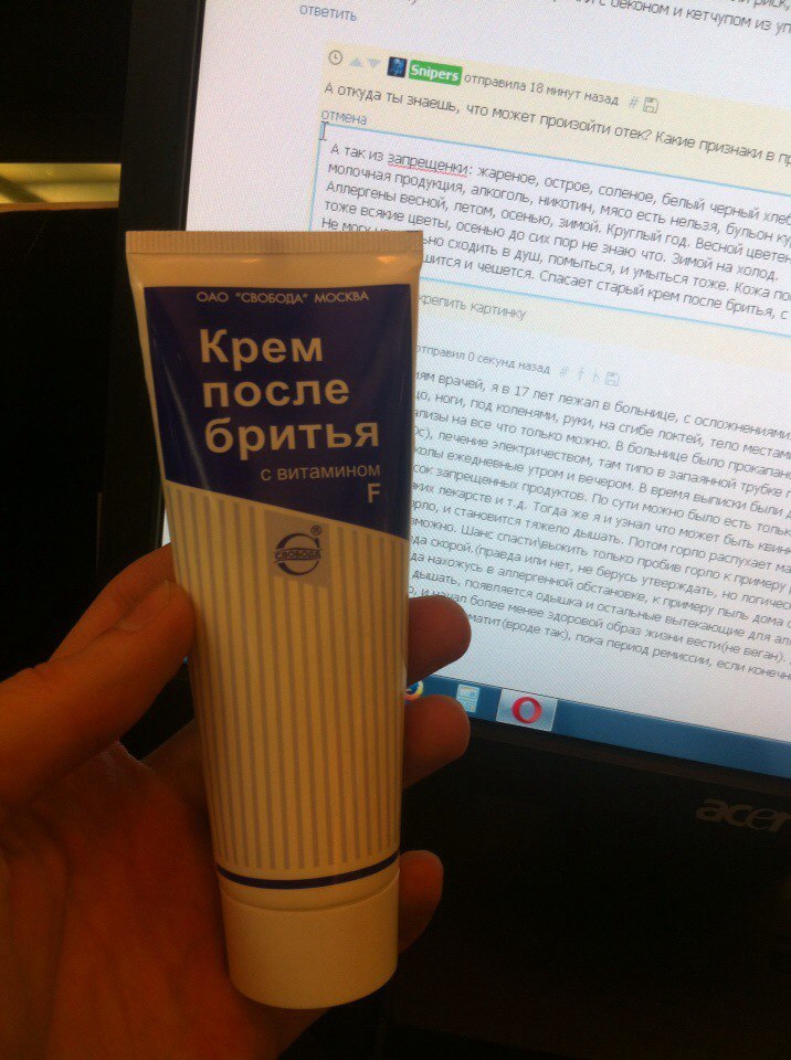Не могу нормально сходить в душ, помыться, и умыться тоже. Кожа после контакта с водой, высыхает, шелушится и чешется. Спасает старый добрый крем после бритья, с витамином F(фото ниже).