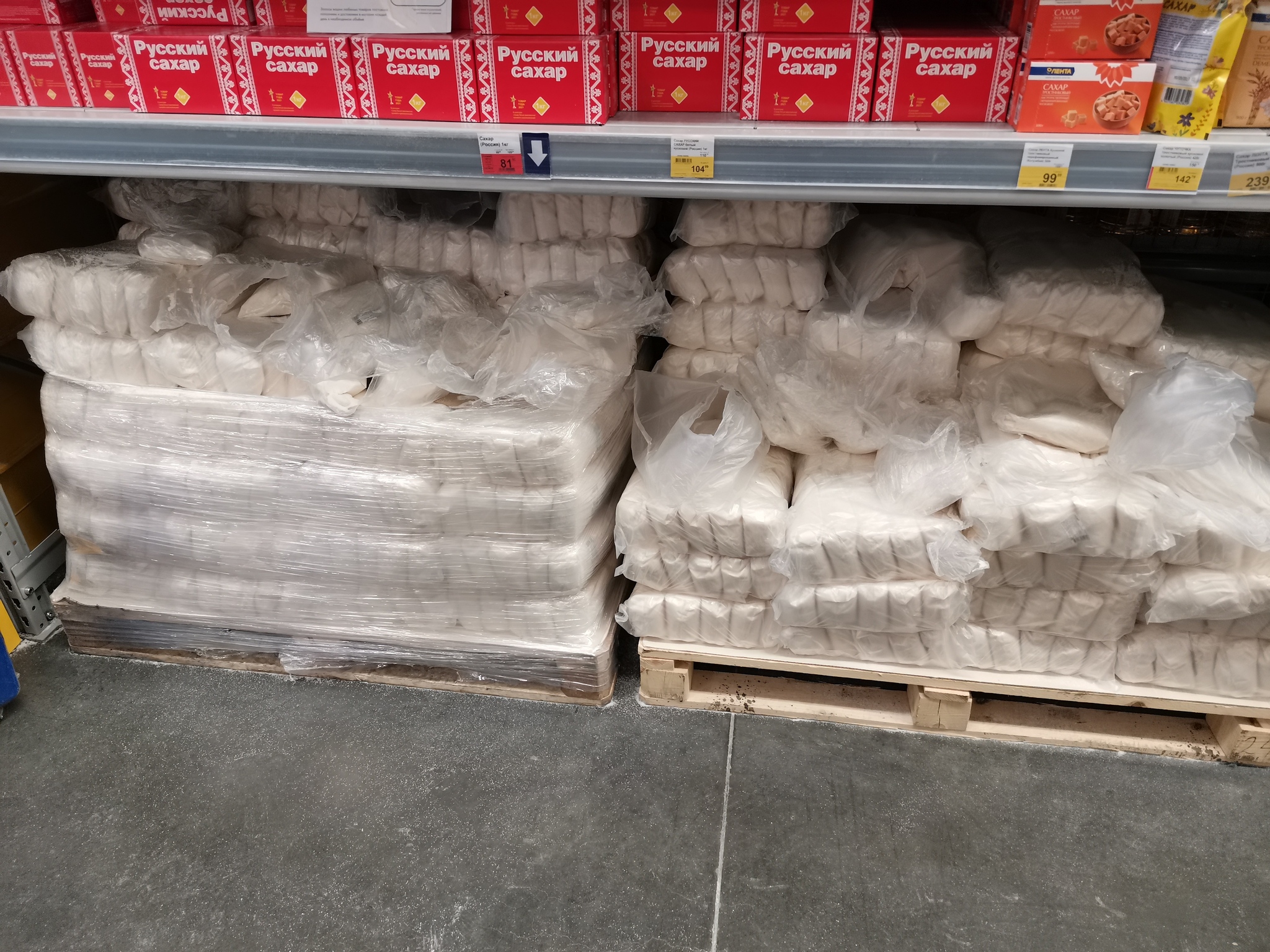 По "традиции" на полках магазинов сахара нет от слова совсем. И вот сегодня 19 марта местный с̶п̶е̶к̶у̶л̶я̶н̶т̶ предприниматель выкатил 2,5 тонны сахара у одного из местных торговых центров. Да ещё и без ограничения в одни руки.