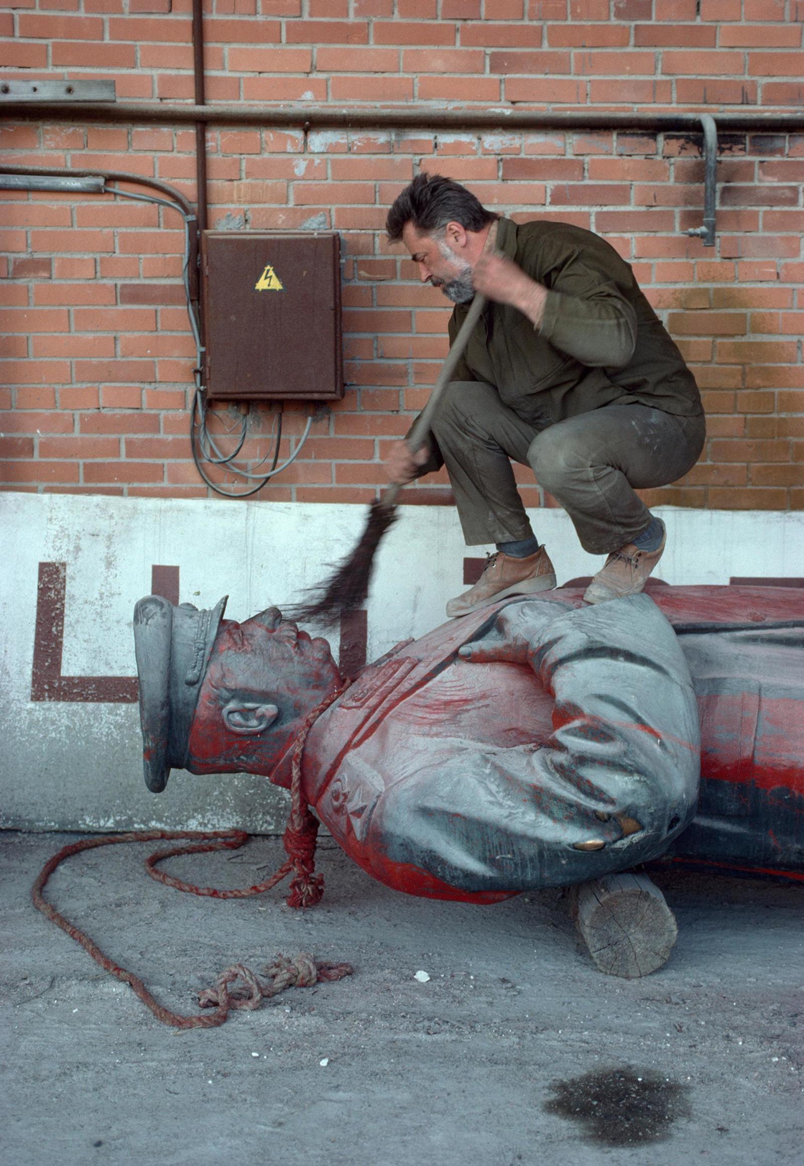 15 SerPri На задворках 6 лет назад "Рабочий сметает грязь с бронзовой статуи Иосифа Сталина на фабрике монументов в Вильнюсе, Литва." Сталин Скульптура Вильнюс Литва История