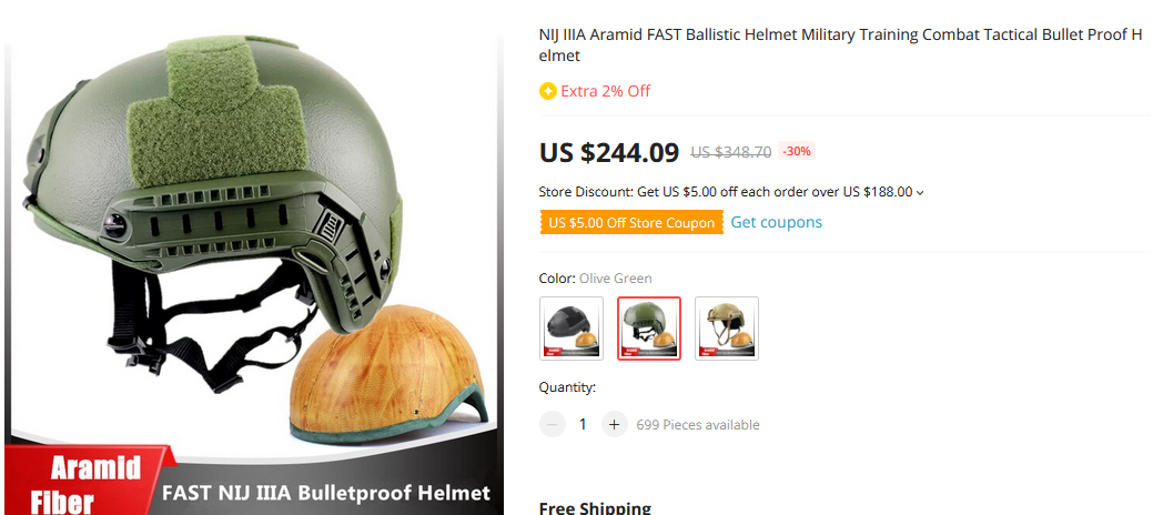 Отдельно стоит рассказать о шлемах. Их точно так же можно заказать на али. Большинство предложений состоят из прессованных синтетических волокон. Определённую защиту особенно от осколков они предоставляют, но не стоит рассчитывать, что они остановять очередь в упор из Калашникова.