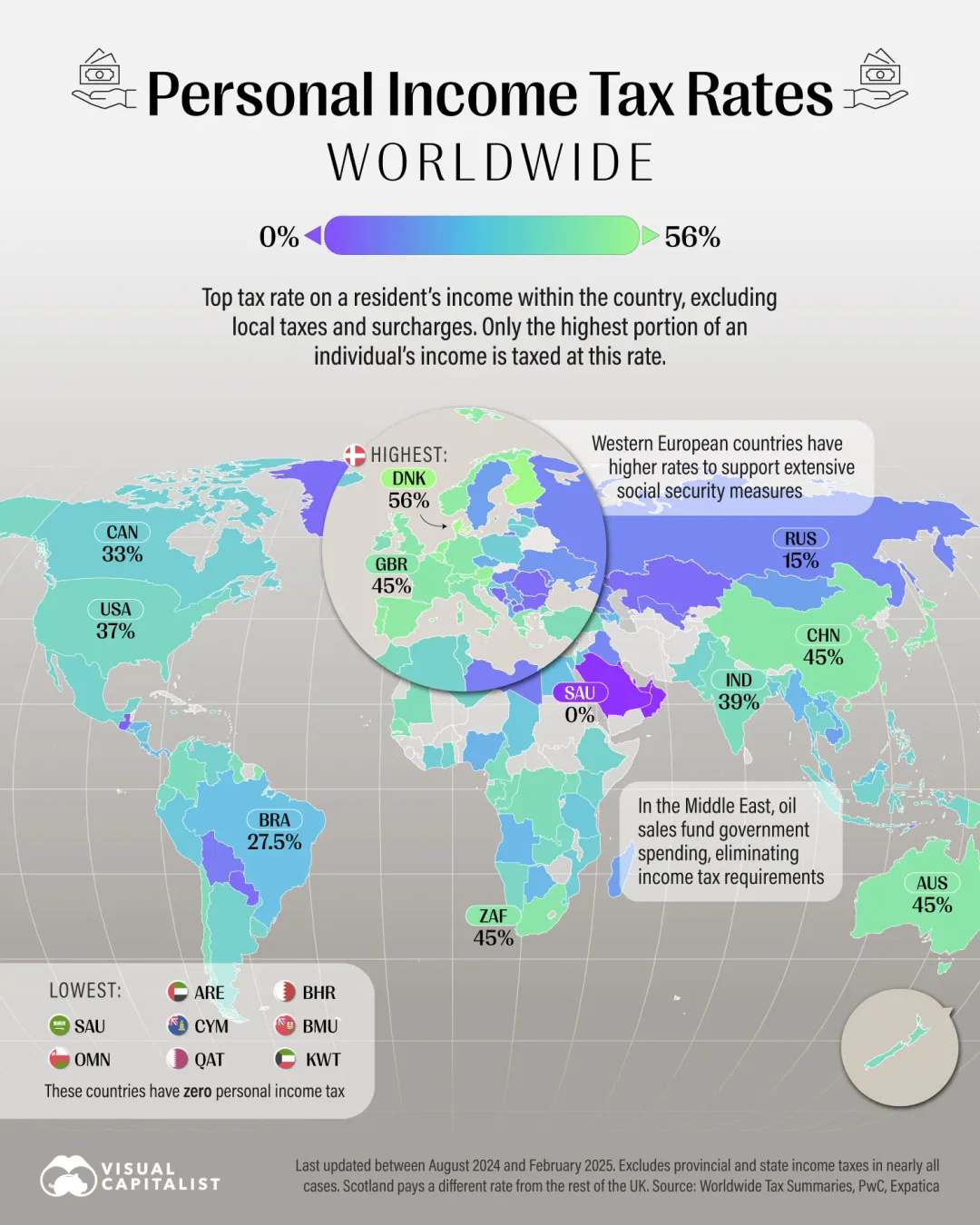 Данные для этой карты взяты из сводных налоговых сводок PwC по всему миру, обновленных в период с августа 2024 года по февраль 2025 года.