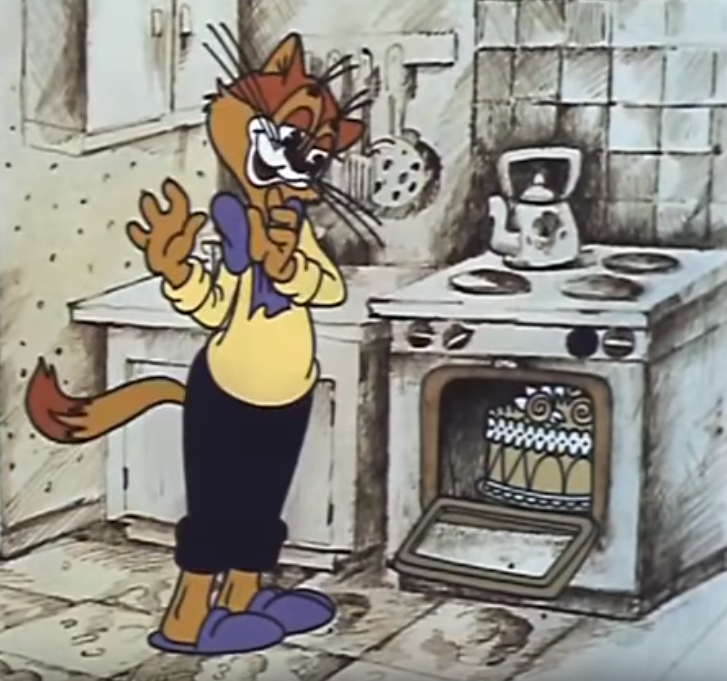 Забавное наблюдение: кот Леопольд ставит в духовку уже готовый кремовый торт (судя по розочкам и оформлению). Вот и живи с таким дружно...