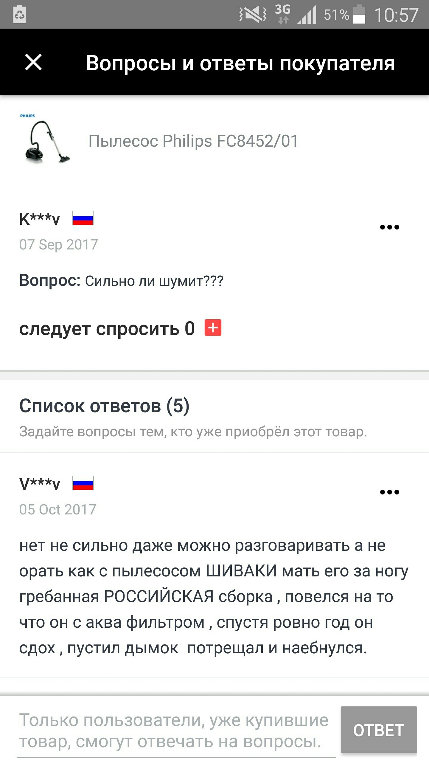 31 rema.bella 8 лет назад Наболело у парня)) Разглядывала намедни пылесос на tmall. Зашла в вопросы-ответы) Надо полагать опыт эксплуатации пылесоса, мать его за ногу, ШИВАКИ оставил в душе пацана глубокую рану... [моё] Пылесос Tmall