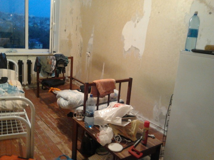После такого любое желание учится отпадает. Все следующие 3 дня, я с соседом пытались сделать из этого хоть что-то, мы отодрали обои которых было слоев 5 уж точно, так же предыдущие жильцы любезно нам оставили половину курицы под ванной, видимо только там можно было спрятать еду, чтобы не делится, эта курица так же понравилась местным тараканам, которых там было не меньше 500 уж точно, благо летом их травили и они были все мертвые, так же мы решил промазать все щели от тараканов, чтобы её допускать ошибок наших предшествеников. В таком состоянии была наша комната на момент начала учебного года.