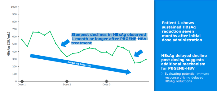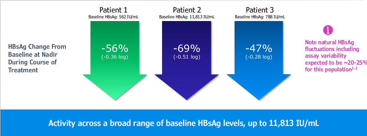 Пока результаты не слишком впечатляют, но и провалом не являются. В моменте у всех трёх пациентов понизился уровень HBsAg: