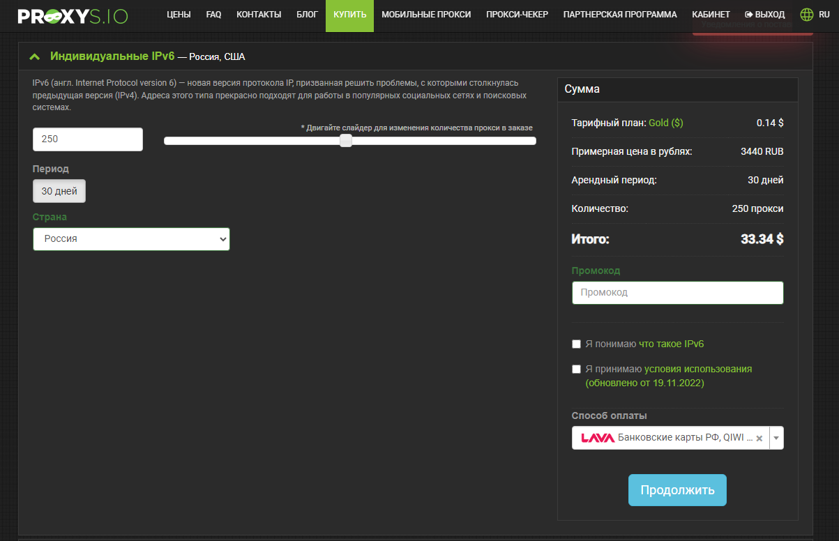 Более детально тарифы рекомендую смотреть на сайте непосредственно перед покупкой. Еще Proxys.io периодически раздает промокоды и проводит праздничные акции, тогда прокси можно купить по более привлекательным ценам. Например, по промокоду cybermasters можно получить дополнительную скидку 5% на любой тариф. Промокод вводится в соответствующее поле в форме заказа.