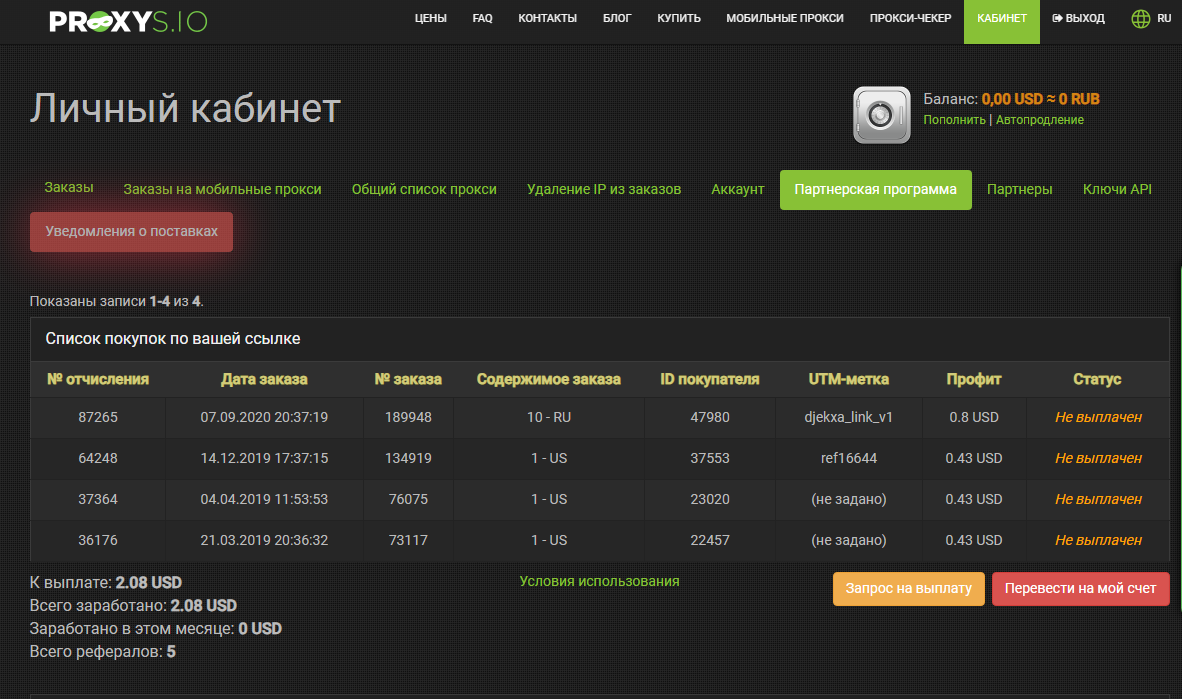 Как уже выше отметил, провайдер Proxys предлагает довольно привлекательные условия по сотрудничеству. Партнерам выплачивается пожизненно от 5% (мобильные прокси) до 20% (все остальные) со всех заказов приведенного пользователя.