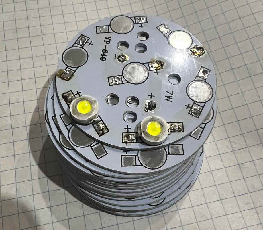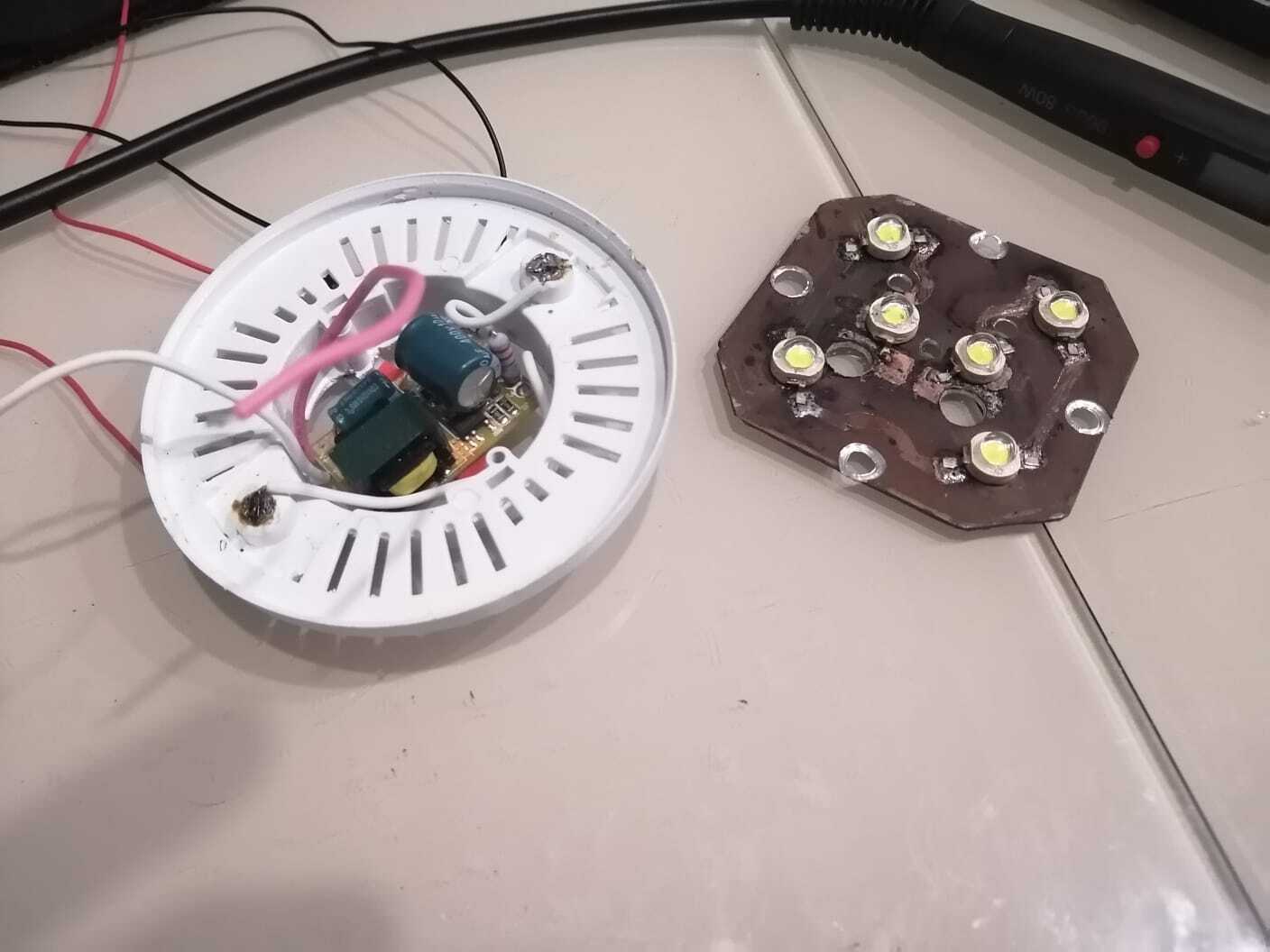 Взял ранее сгоревшие светодиоды на алюминиевой подложке (она коричневого цвета) и перепаял их. Ранее я перегрел светодиоды и