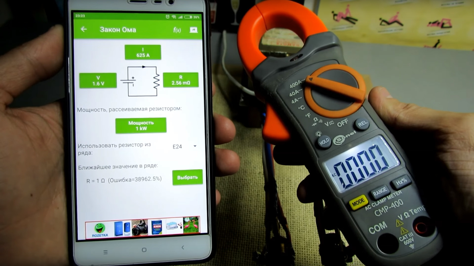 Туда нужно ввести несколько уже известных значений. Напряжение у нас было 1.6 вольта, измеренная мощность показала ровно 1 кВт. Дальше нам нужен ток, тут мощность будем делить на напряжение, нажимаем нужный пункт и получаем расчетные параметры выходного тока трансформатора. Получился ток в 625 ампер, даже сопротивление медного провода посчитало, 2.56 милиома. Вот так можно решать проблемы на экзаменах с помощью мобилы в кармане. Чуть позже попробуем достать токовые клещи помощней.