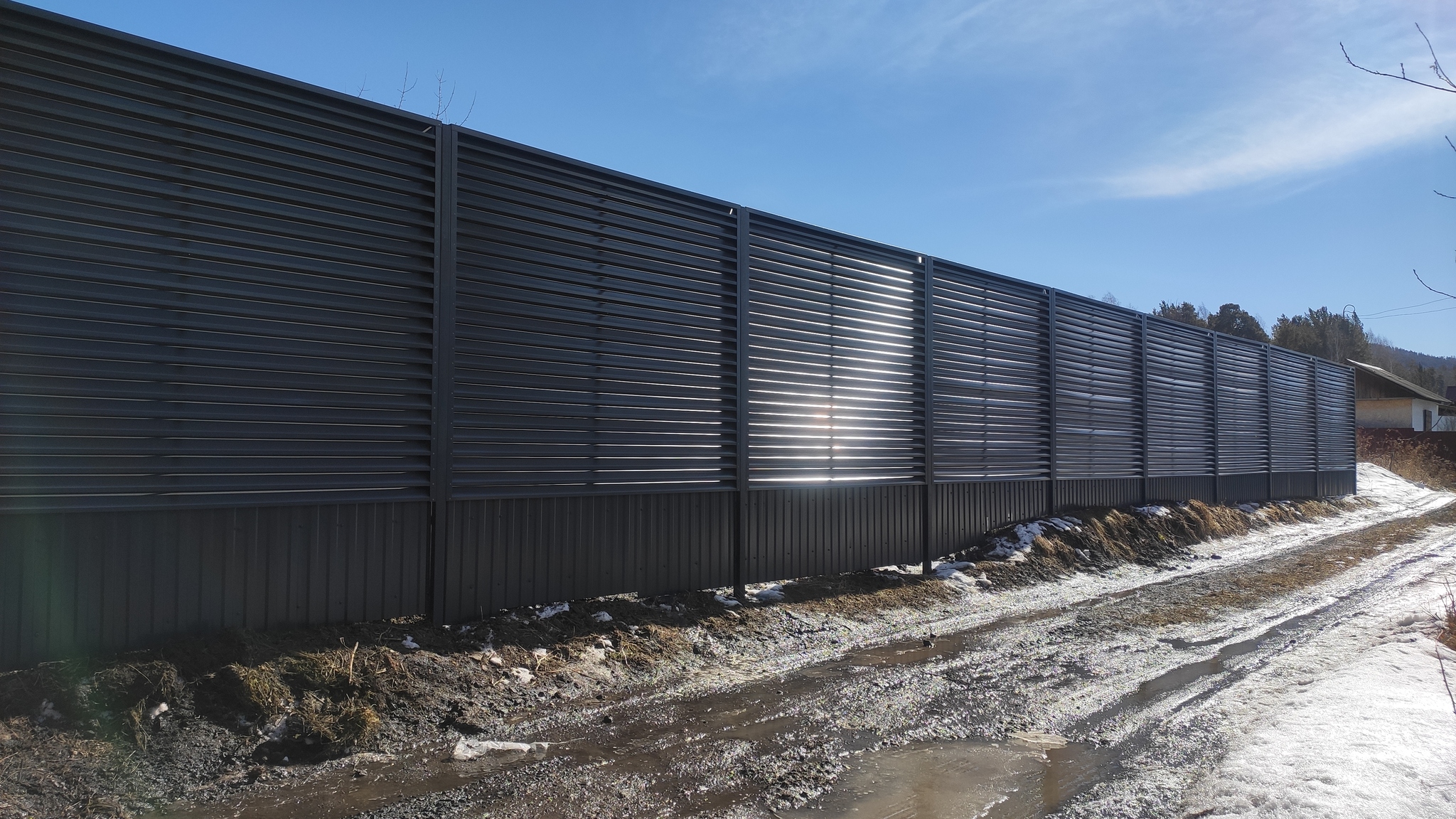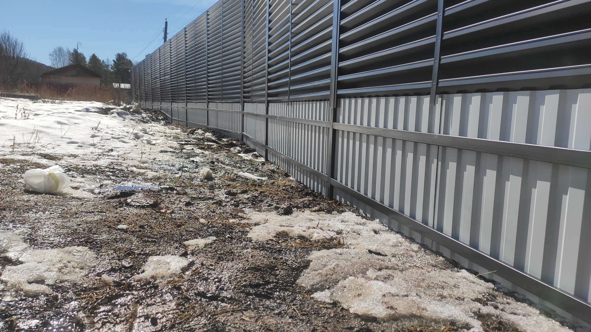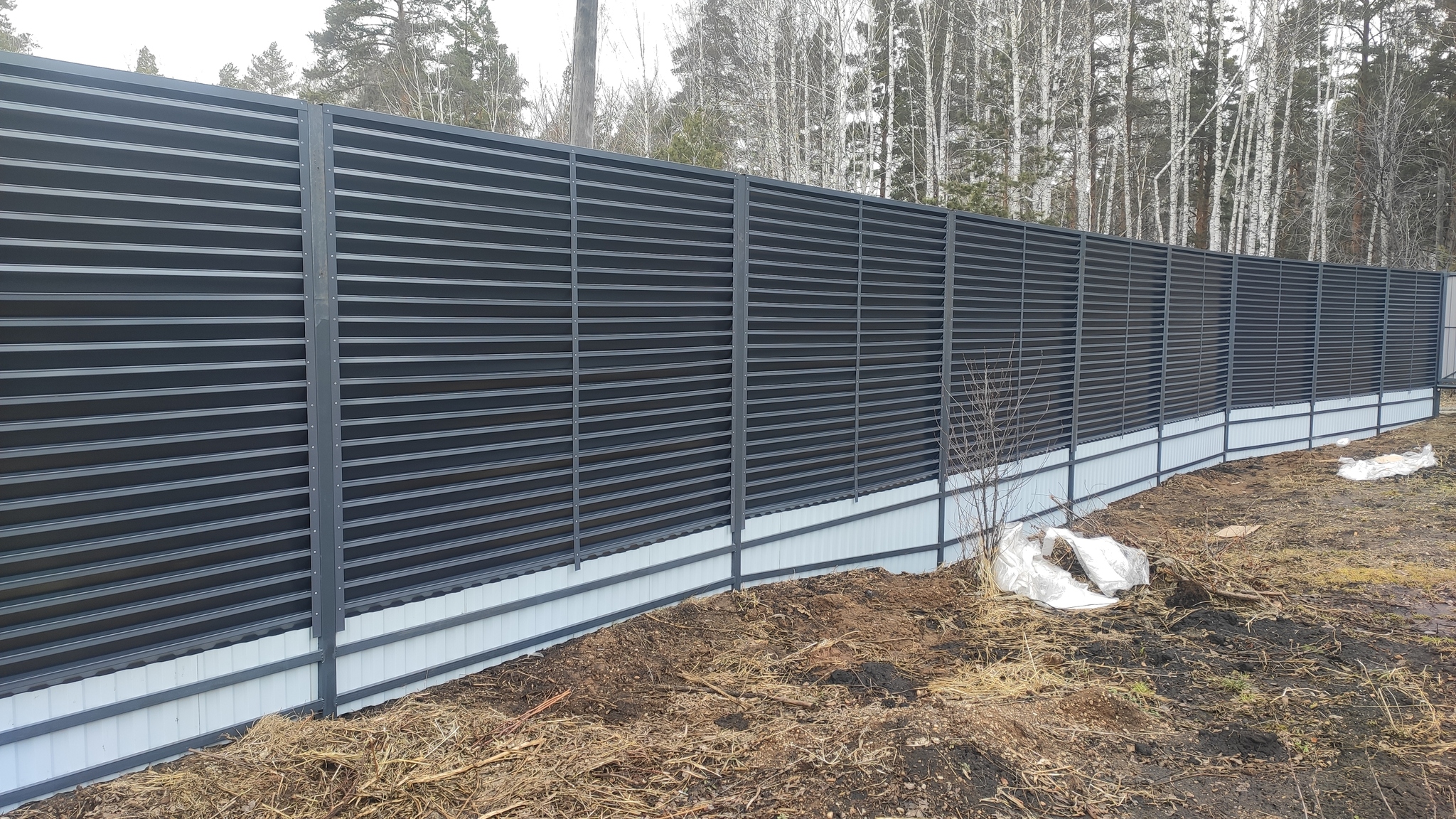 Участок с уклоном. Случилось так, что сначала построили забор с одной стороны, а потом стали делать с перпендикулярной и оказалось, что столбы слишком низкие (при выравнивании по высоте с последним нижним угловым столбом). Поэтому столбы наварили сверху до высоты углового столба. Забор жалюзи с заранее заданной высотой секции жалюзи как я понимаю. Поэтому снизу забора образовалось пустота, высотой 300-500мм. Наварили перемычки и закрыли профлистом.