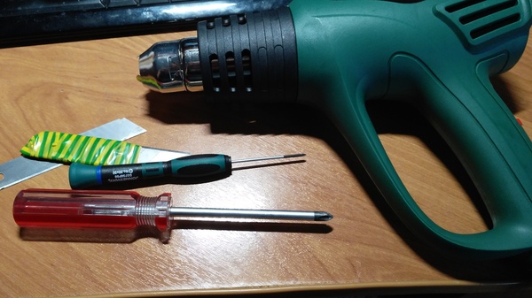 В моем случае фен строительный, пара отверток, пара лезвий.